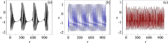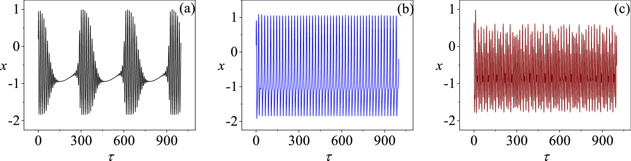 Figure 4. The patterns exhibited by an isolated neuron with different selections of angular frequency ω: (a) clustered firing at ω = 0.02; (b) spike firing at ω = 0.3; (c) chaotic firing at ω=1.3. Other parameters are held constant at a = 0.7, b = 0.3, c = 0.4, ξ = 0.175, I0 = 0.1, A = 0.4, with the initial conditions of the neuron circuit set to (0.2, 0.1). |