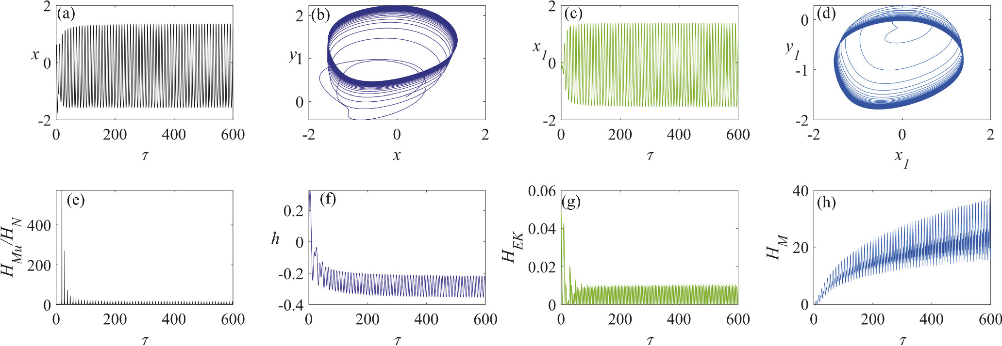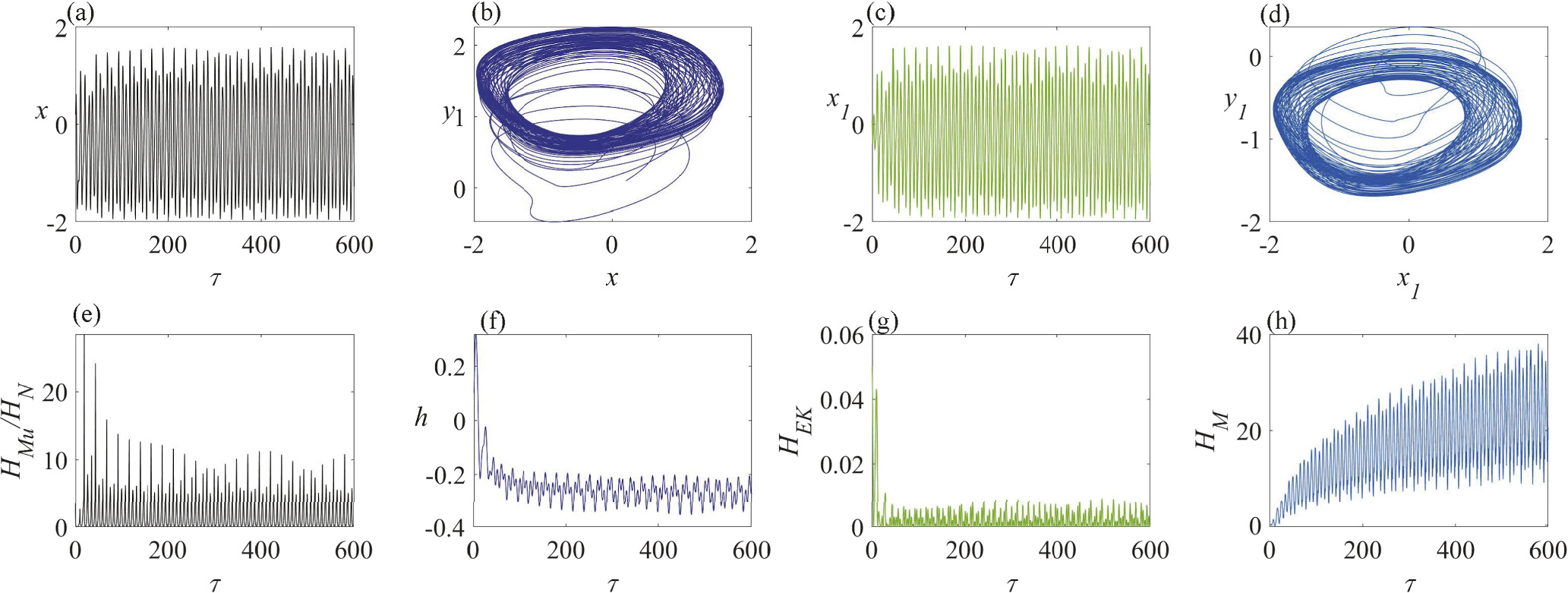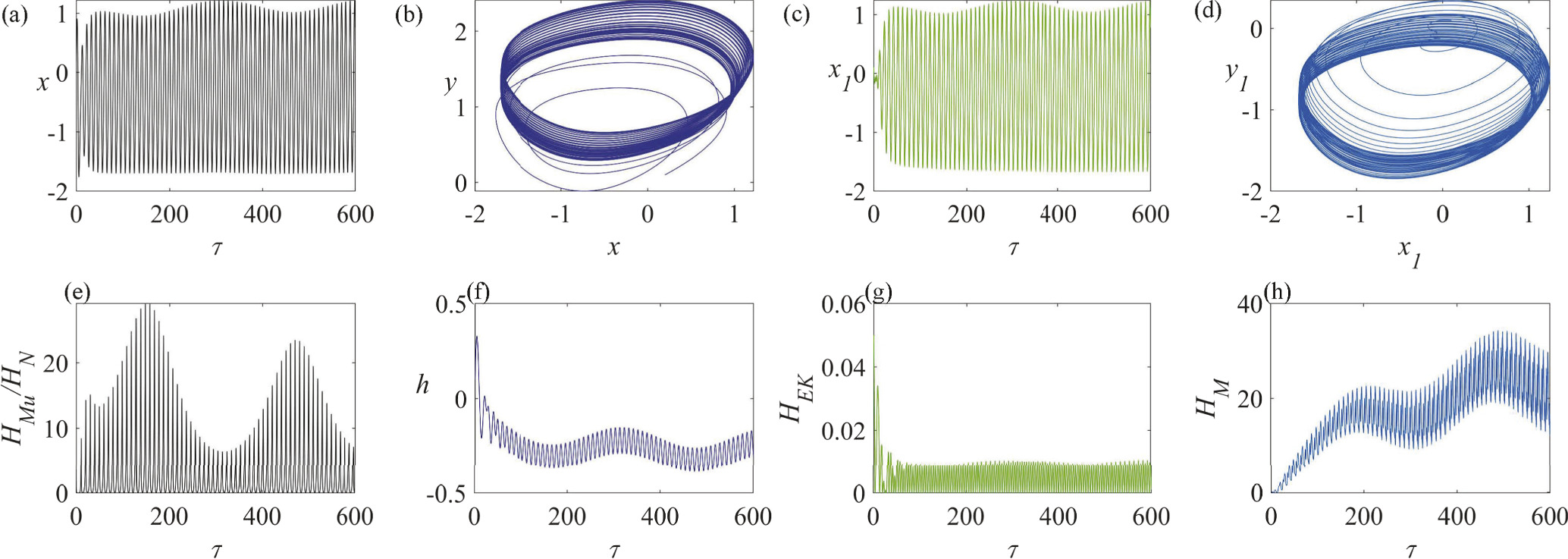 Figure 12. The chaotic firing state of a memristor synapse-coupled system involving a neuron and a skeletal muscle cell: (a) the membrane potential of the neuron; (b) the attractor of the neuron circuit; (c) the membrane potential of the skeletal muscle cell; (d) the attractor of the skeletal muscle cell circuit; (e) the temporal evolution of the Hamiltonian energy ratio between the skeletal muscle cell and the neuron; (f) the temporal evolution of the displacement of the active beam; (g) the temporal evolution of the kinetic energy of the active beam; (h) the temporal evolution of the field energy in the memristor-coupled channel. The parameter values are set to k1 = 1.8. |
