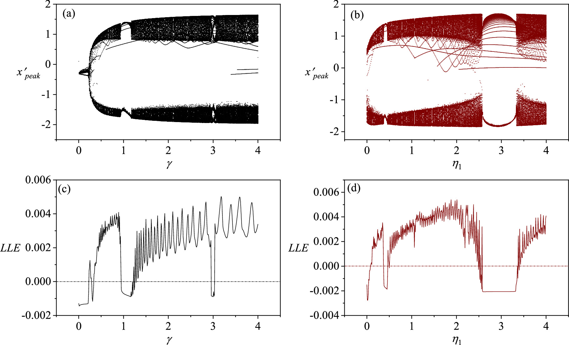 Figure 8. The bifurcation diagrams and maximum Lyapunov exponents for the variable direction parameters γ and η1 within the system where a neuron and a skeletal muscle cell are coupled via a memristor. In the diagrams, the parameters are assigned the following values: (a, c) η1 = 0.4;(b, d)γ = 1. The other parameters are fixed at a = 0.7, b = 0.3, c = 0.4, ξ = 0.175, I0 = 0.1, A = 0.4, λM = 0.1, α = 0.1, β = 0.1, η2 = 0.12, k1 = 0.1, k2 = 0.1, k3 = 0.1, m1 = 0.1, m2 = 0.1, m3 = 0.1, ω = 1.3. The system’s initial conditions are set to (0.2, 0.1, 0, 0.1, 0.1, 0.1, 0.1, 0.1). |