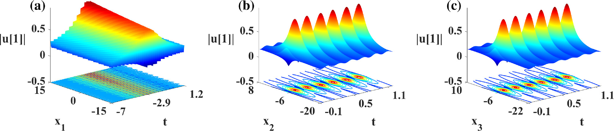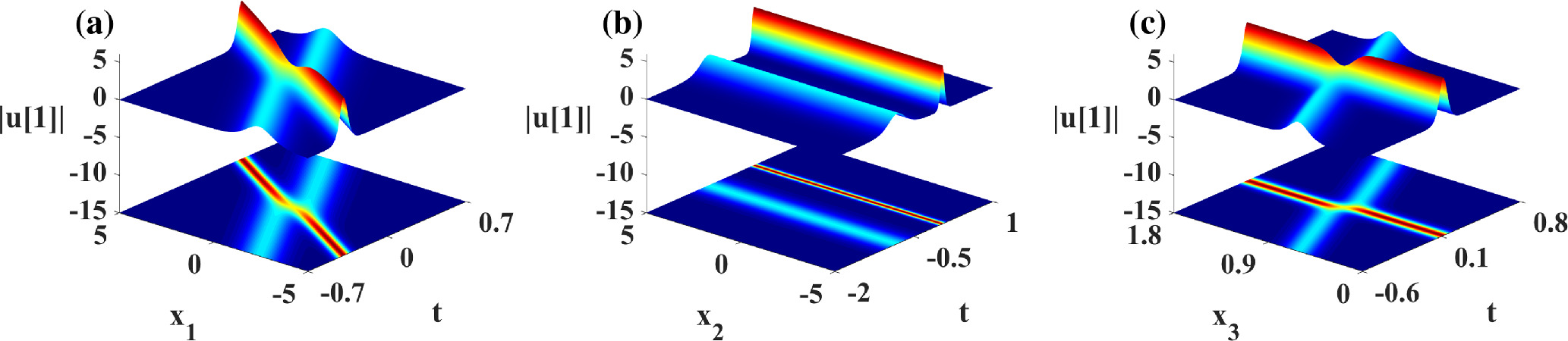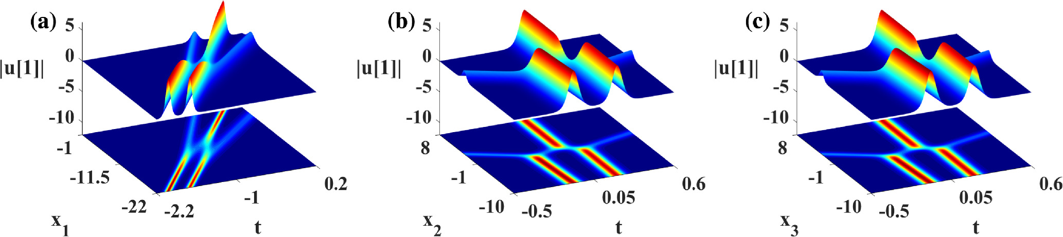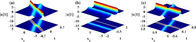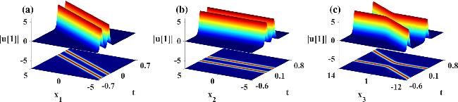 Figure 8. Propagation and density plots for the degenerate solution of nonlinear wave solution (28) based on λ = 2, where β = 1, ${\omega }_{1}=-2\wp ^{\prime} (\alpha )$, ${\omega }_{3}=\wp (\alpha )-\wp ^{\prime} (\alpha )$, σ2 = σ3 = 1, σi(i = 4, …, n) = 0, ${C}_{1,j}={\rm{\exp }}({\alpha }_{1,j})$. (a) x2 = x3 = 1; (b) x1 = x3 = 1; (c) x1 = x2 = 1.