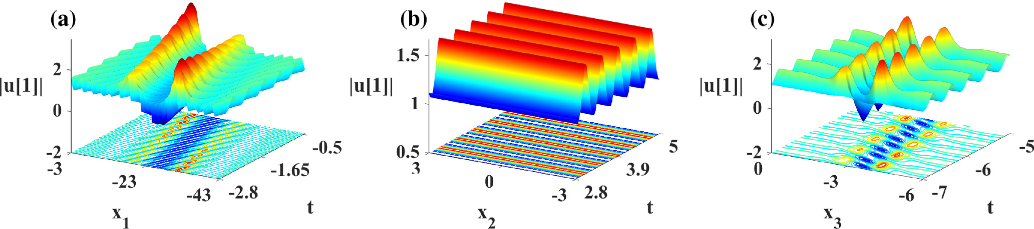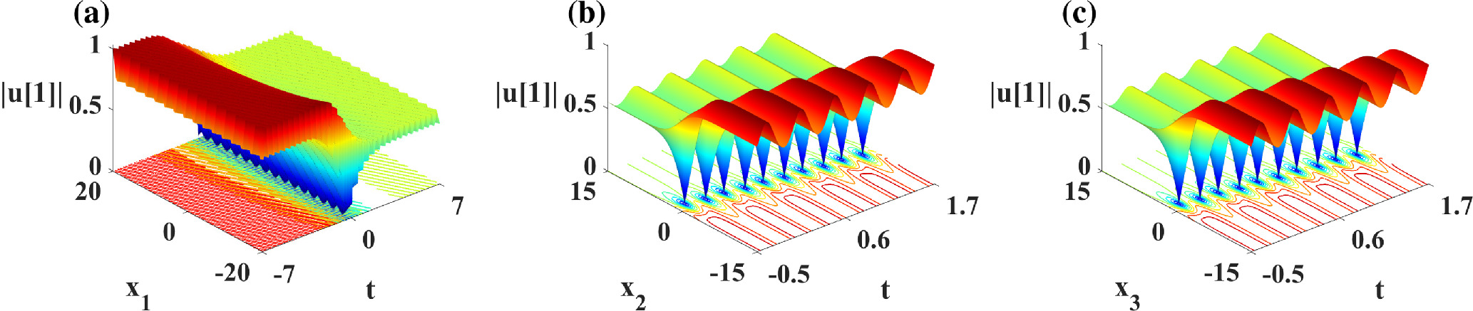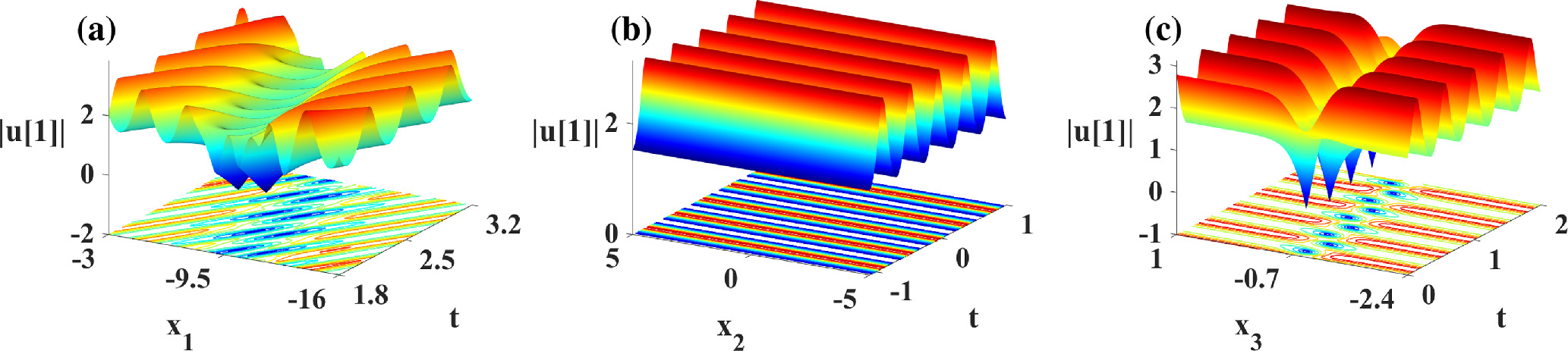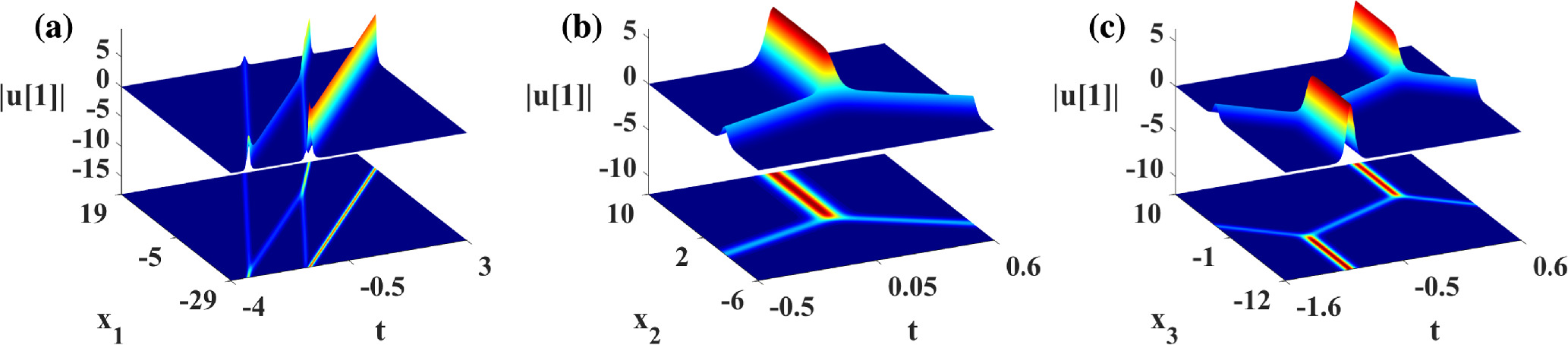 Figure 8. Propagation and density plots for the degenerate solution of nonlinear wave solution (28) based on λ = 2, where β = 1, ${\omega }_{1}=-2\wp ^{\prime} (\alpha )$, ${\omega }_{3}=\wp (\alpha )-\wp ^{\prime} (\alpha )$, σ2 = σ3 = 1, σi(i = 4, …, n) = 0, ${C}_{1,j}={\rm{\exp }}({\alpha }_{1,j})$. (a) x2 = x3 = 1; (b) x1 = x3 = 1; (c) x1 = x2 = 1.