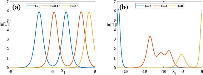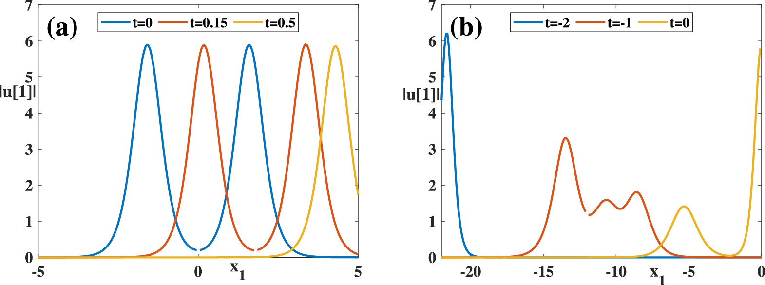 Comparing figures 5 and 7, it can be summarized that the degenerate solution obtained after construction by elliptic square root (M = 2) is a two-soliton solution, and the degenerate solution obtained by elliptic cube root (M = 3) is a three-soliton solution. In order to numerically verify the stability of nonlinear wave solutions, we take the degenerate solutions of nonlinear wave solutions (25) and (28) as examples and conduct numerical simulations using the finite difference method. Figure 9 shows the evolution for the degenerate solutions of nonlinear wave solutions (25) (the initial condition is taken as t = 0) and (28) (the initial condition is taken as t = − 2) with spatial variable x1 at three different time points. The numerical validation of other solutions, as well as more numerical solutions, and even data-driven solutions obtained from the physics informed neural network, are our next research topics to overcome the difficulty of constructing exact solutions on periodic backgrounds.