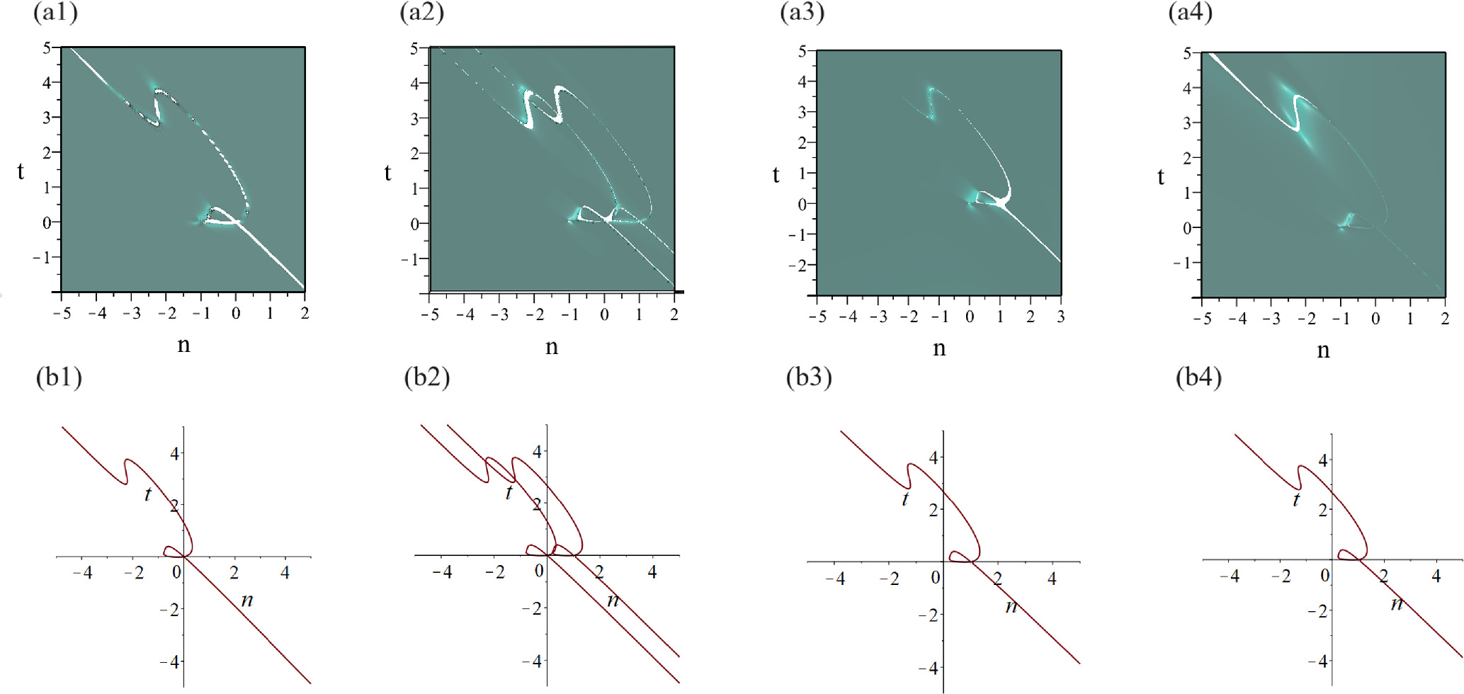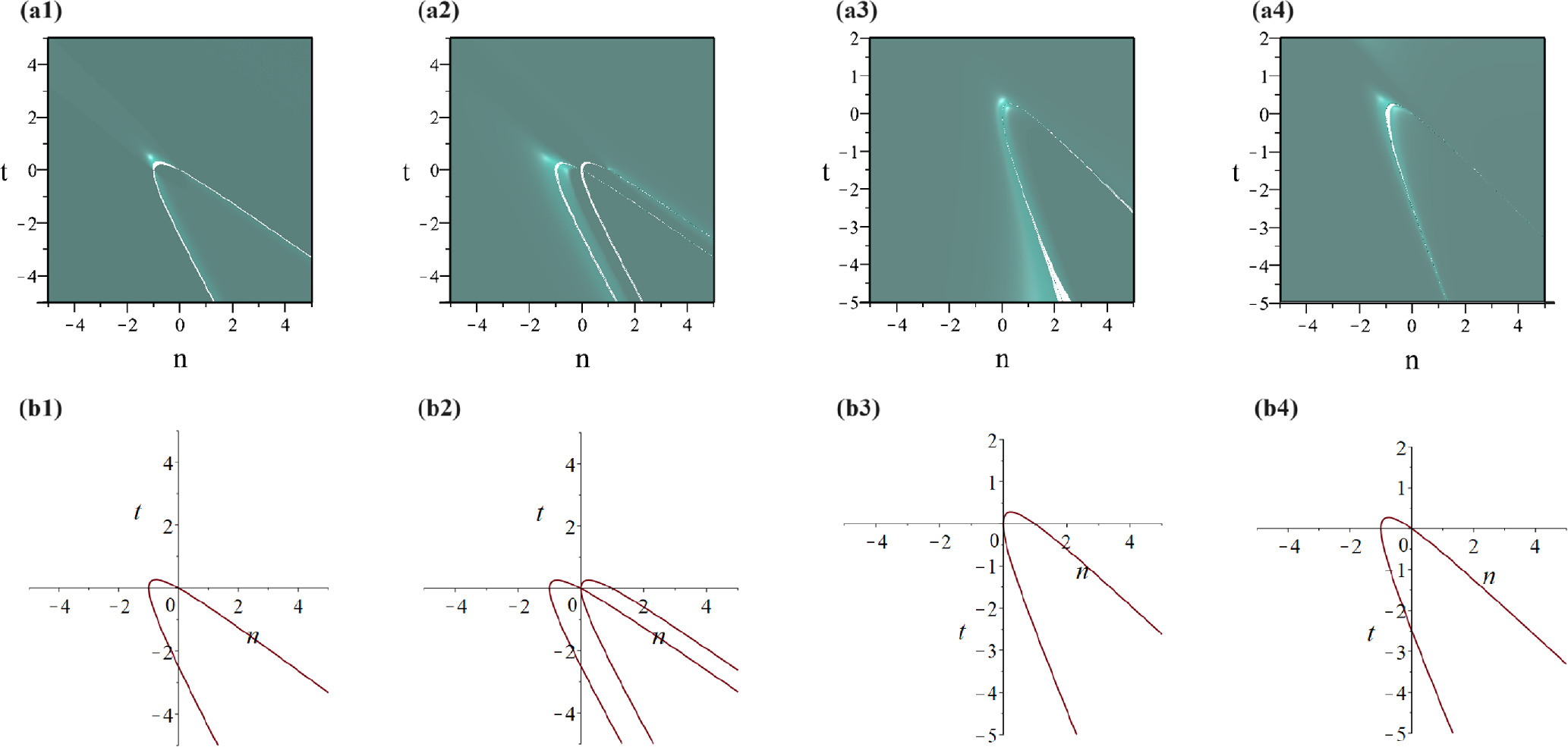 in which ${\xi }_{1}=\frac{3n}{2}\mathrm{ln}2+\frac{7t}{8}$, α = n + t. Meanwhile, the three-dimensional structures of solution equation (11) are displayed in figures 2(a1)–(a4) respectively. From solution equation (11), we can clearly know that ${\widetilde{a}}_{n},\ {\widetilde{d}}_{n}$ exist the same singularity trajectory curve: A1 = 0, ${\widetilde{b}}_{n}$ owns two singularity trajectory curves: A1 = 0, A2 = 0 while ${\widetilde{c}}_{n}$ haves one singularity trajectory curve: A2 = 0. figures 2(b1)–(b4) depict the singularity trajectory curves of ${\widetilde{a}}_{n},\ {\widetilde{b}}_{n},\ {\widetilde{c}}_{n}\ {\widetilde{d}}_{n}$, respectively.
