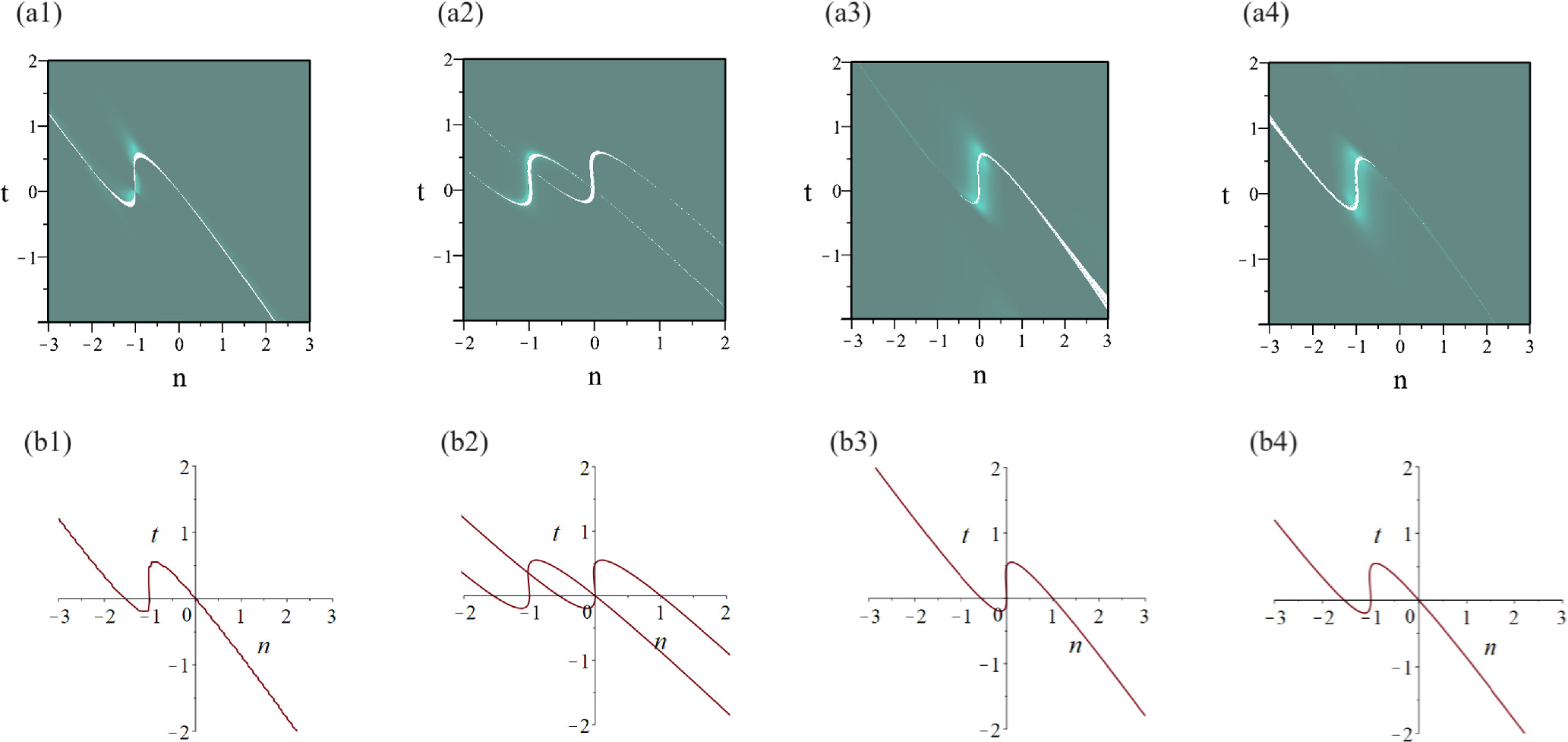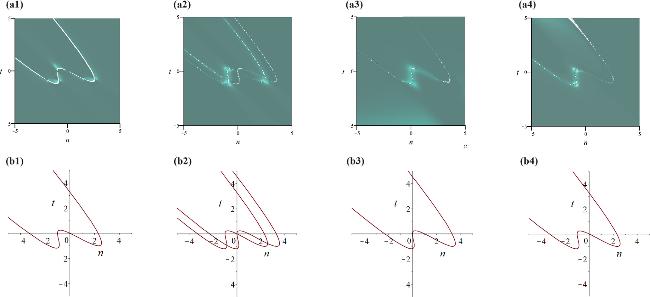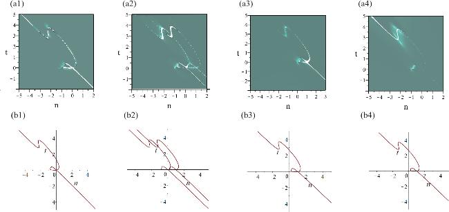 with ${\xi }_{2}=n\mathrm{ln}2+\frac{3}{4}t$. For observing the structures of solution equation (13), we display the three-dimensional structures shown in figures 4(a1)–(a4), while their corresponding trace curves are demonstrated in figures 4(b1)–(b4). Then, we give two types of limit states of solution equation (13):