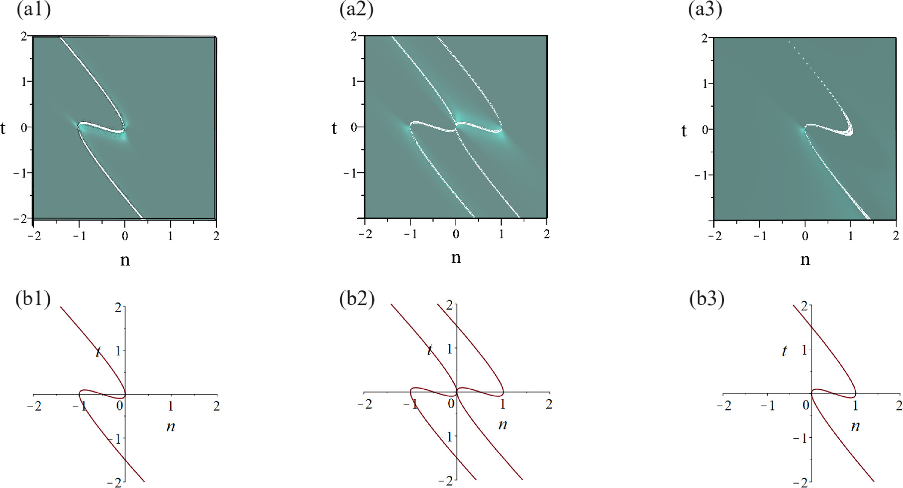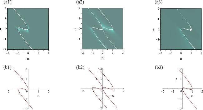 from which it is obvious that ${\widetilde{a}}_{n}$ possesses the singularity trajectory curve: 2α3 + 3α2 + n = 0, ${\widetilde{b}}_{n}$ possesses the singularity trajectory curve: 4α6 − 5α4 − 4tα3 + n2 = 0, while ${\widetilde{c}}_{n}$ possesses the singularity trajectory curve: 2α3 − 3α2 + n = 0. According to above results, we present the three-dimensional structures of solutions ${\widetilde{a}}_{n},\ {\widetilde{b}}_{n},\ {\widetilde{c}}_{n}$, as shown in figures 3(a1)-(a3), respectively, whose corresponding trajectory curves of ${\widetilde{a}}_{n},\ {\widetilde{b}}_{n},\ {\widetilde{c}}_{n}$ are displayed in figures 3(b1)–(b3), respectively. Meanwhile, we can easily know that ${\widetilde{a}}_{n}\to 1,\ {\widetilde{b}}_{n}\to 1$ as α → ± ∞, t → ± ∞ while ${\widetilde{c}}_{n}$ tends to 0 with t → + ∞ or ${\widetilde{c}}_{n}$ tends to +∞ with t → − ∞.