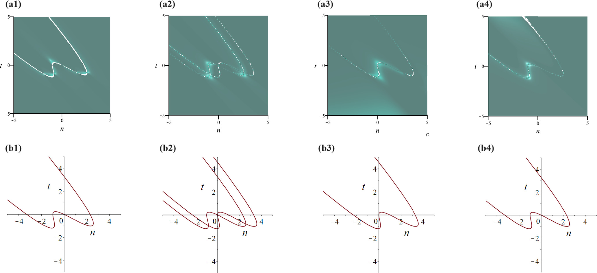 Figure 1. The structures of solution equation (10): (a1)–(a4) represent the three-dimensional maps of ${\widetilde{a}}_{n},\ {\widetilde{b}}_{n},\ {\widetilde{c}}_{n},\ {\widetilde{d}}_{n}$, respectively; (b1)–(b4) depict the singular trace curves of ${\widetilde{a}}_{n},\ {\widetilde{b}}_{n},\ {\widetilde{c}}_{n},\ {\widetilde{d}}_{n}$, respectively.