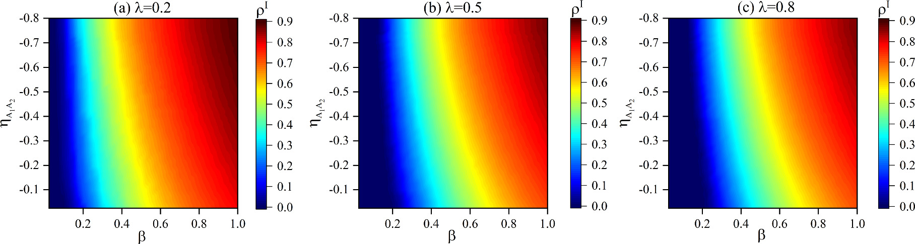 Figure 10. The influence of $\beta $ and the impact of negative correlation ${\eta }_{{A}_{1}{A}_{2}}$ on ${\rho }^{I}$. The transmission rates of official information in different subplots are set as follows: (a) $\lambda =0.2$, (b) $\lambda =0.5$, (c) $\lambda =0.8$. Other parameters are set to be $f=0.6$, $K=0.3$, ${\omega }_{2}=0.5$, ${\delta }_{1}=0.4$, ${\delta }_{2}=0.5$, $\mu =0.5$, ${\varphi }_{1}=0.4$. |