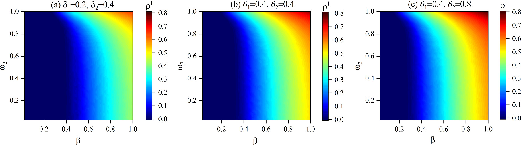Figure 11. The influence of $\beta $ and ${\omega }_{2}$ on ${\rho }^{I}$. The information forgetting rates in different subplots are set as follows: (a) ${\delta }_{1}=0.2,\,{\delta }_{2}=0.4$, (b) ${\delta }_{1}=0.4,\,{\delta }_{2}=0.4$, (c) ${\delta }_{1}=0.4,\,{\delta }_{2}=0.8$. Other parameters are set as follows: ${\eta }_{{A}_{1}{A}_{2}}=0.46$, $\lambda =0.3$, $K=0.1$, $f=0.9$, $\mu =0.5$, ${\varphi }_{1}=0.4$, ${\varphi }_{2}=0.6$. |