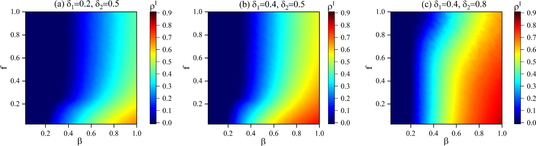 Figure 12. The function of epidemic scale ${\rho }^{I}$ with basic infection rate $\beta $ and different information decay coefficients $f$. The information forgetting rates in different subplots are set as follows: (a) ${\delta }_{1}=0.2,\,{\delta }_{2}=0.5$, (b) ${\delta }_{1}=0.4,\,{\delta }_{2}=0.5$, (c) ${\delta }_{1}=0.4,\,{\delta }_{2}=0.8$. Other parameters are set as follows: ${\eta }_{{A}_{1}{A}_{2}}=0.46$, $\lambda =0.2$, $K=0.3$, ${\omega }_{2}=0.5$, $\mu =0.5$, ${\varphi }_{1}=0.4$, ${\varphi }_{2}=0.8$. |