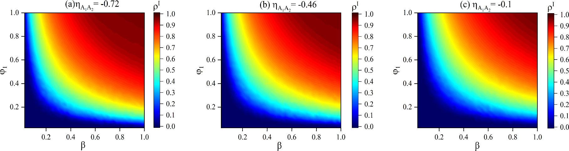 Figure 14. The function of epidemic scale ${\rho }^{I}$ with infection probability $\beta $ and attenuation factor ${\varphi }_{1}$. The negative correlation in different subplots is set as follows: (a) ${\eta }_{{A}_{1}{A}_{2}}=-0.72$, (b) ${\eta }_{{A}_{1}{A}_{2}}=-0.46$, (c) ${\eta }_{{A}_{1}{A}_{2}}=-0.1$. Other parameters are set as follows: $\lambda =0.2$, $f=0.3$,$K=0.3$, ${\omega }_{2}=0.5$, ${\delta }_{1}=0.4$, ${\delta }_{2}=0.5$, $\mu =0.5$. |