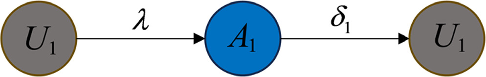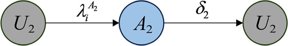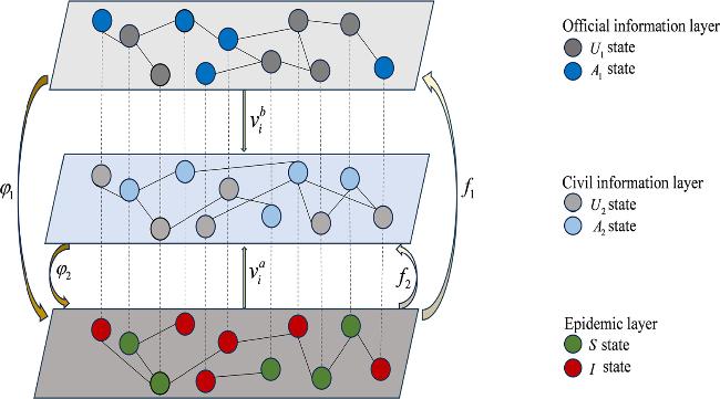 Figure 1. Structure of the three-layer ${U}_{1}{A}_{1}{U}_{1}-{U}_{2}{A}_{2}{U}_{2}-SIS$ propagation network framework. |