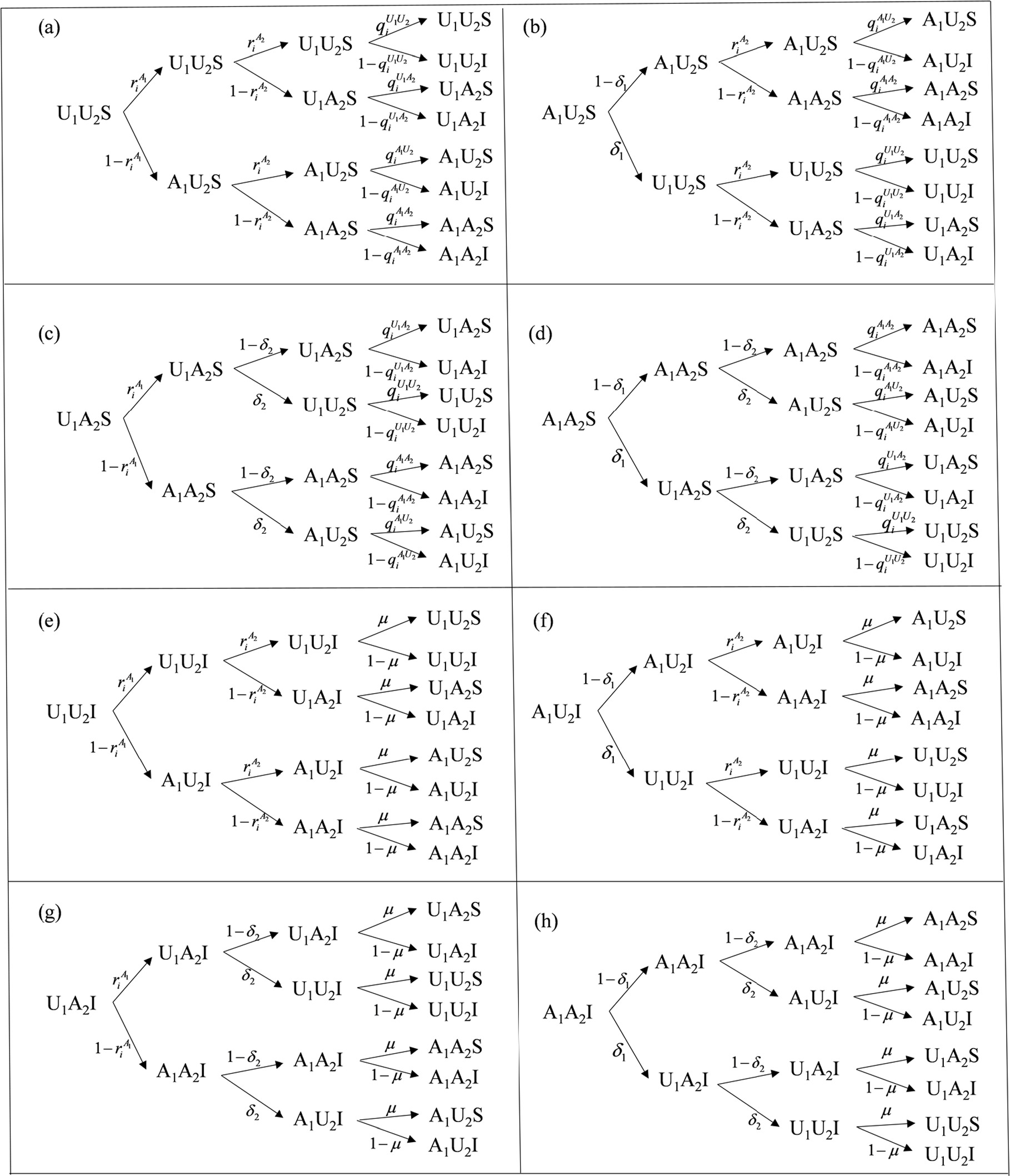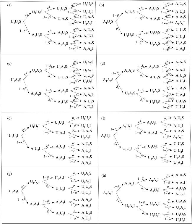 Figure 6. Probability tree of the eight possible node states in the model. |