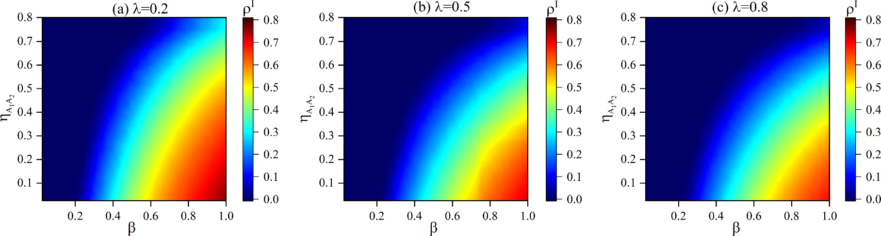 Figure 8. The influence of $\beta $ and the impact of positive correlation ${\eta }_{{A}_{1}{A}_{2}}$ on ${\rho }^{I}$. The transmission rate of official information in different subplots is set as follows: (a) $\lambda =0.2$, (b) $\lambda =0.5$, (c) $\lambda =0.8$. Other parameters are set to be $f=0.6$, $K=0.3$, ${\omega }_{2}=0.5$, ${\delta }_{1}=0.4$, ${\delta }_{2}=0.5$, $\mu =0.5$, ${\varphi }_{1}=0.4$, ${\varphi }_{2}=0.8$. |