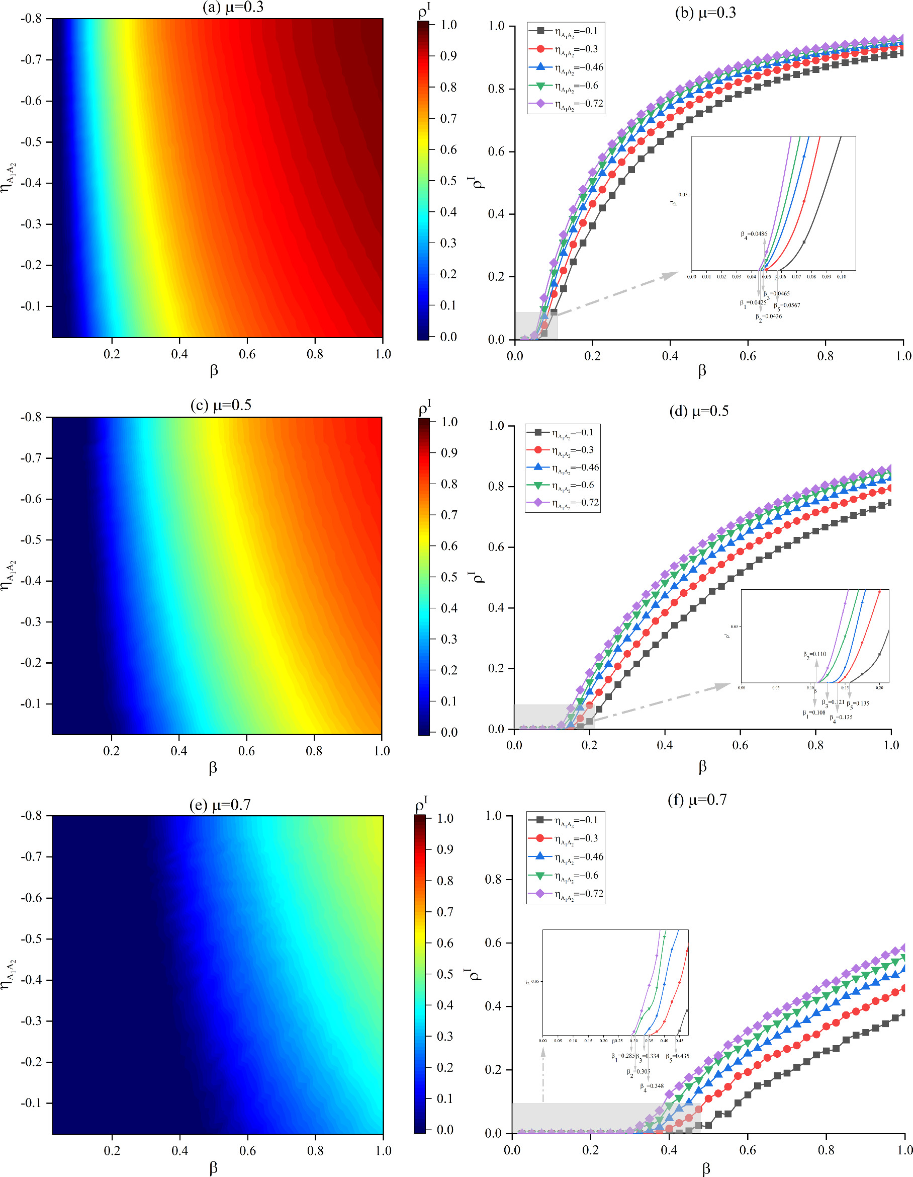 Figure 9. Epidemic scale as a function of the basic infection rate and the impact of different negative correlation ${\eta }_{{A}_{1}{A}_{2}}$. The basic recovery rate in different subplots is set as follows: (a) and (b) $\mu =0.3$, (c) and (d) $\mu =0.5$, (e) and (f) $\mu =0.7$. Other parameters are set as follows: $\lambda =0.5$, $f=0.6$, $K=0.3$, ${\omega }_{2}=0.5$, ${\delta }_{1}=0.4$, ${\delta }_{2}=0.5$, ${\varphi }_{1}=0.4$. |