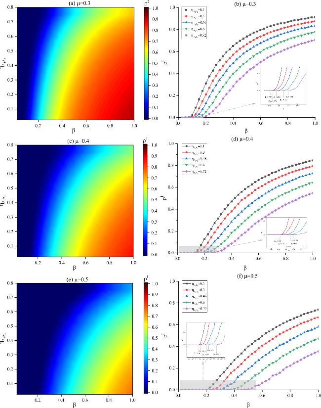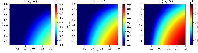Figure 13. The function of epidemic scale ${\rho }^{I}$ with basic infection rate $\beta $ and different positive correlation ${\eta }_{{A}_{1}{A}_{2}}$. The decay factors in different subplots are set as follows: (a) ${\varphi }_{1}=0.3$, (b) ${\varphi }_{1}=0.5$, (c) ${\varphi }_{1}=0.7$. Other parameters are set as follows: $\lambda =0.5$, $f=0.6$, $K=0.3$, ${\omega }_{2}=0.5$, ${\delta }_{1}=0.4$, ${\delta }_{2}=0.5$, $\mu =0.5$, ${\varphi }_{2}=0.8$. |