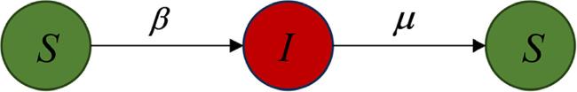 Figure 5. Propagation process of the epidemic transmission. The green and red circles represent the susceptible and infected states in the SIS model, which appear in the epidemic layer. |
