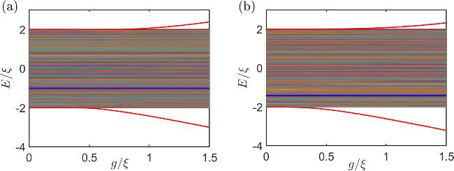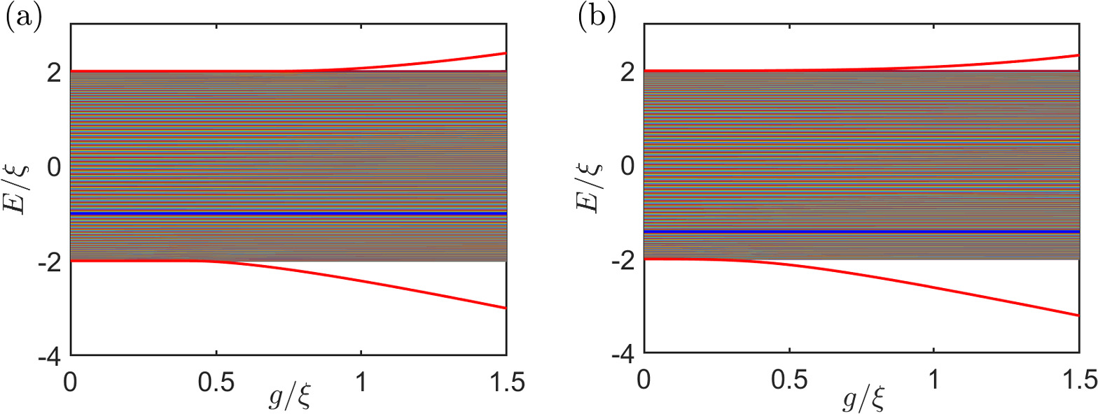 Figure 2. Energy diagram of the giant atom–CRW coupled system. The thick blue line in the continuum represents the BIC, while the red curves represent the BOC. The parameters are set to Ω = − ξ, N = 6, φ = π in (a) and ${\rm{\Omega }}=-\sqrt{2}\xi ,N=12,\phi =0$ in (b).