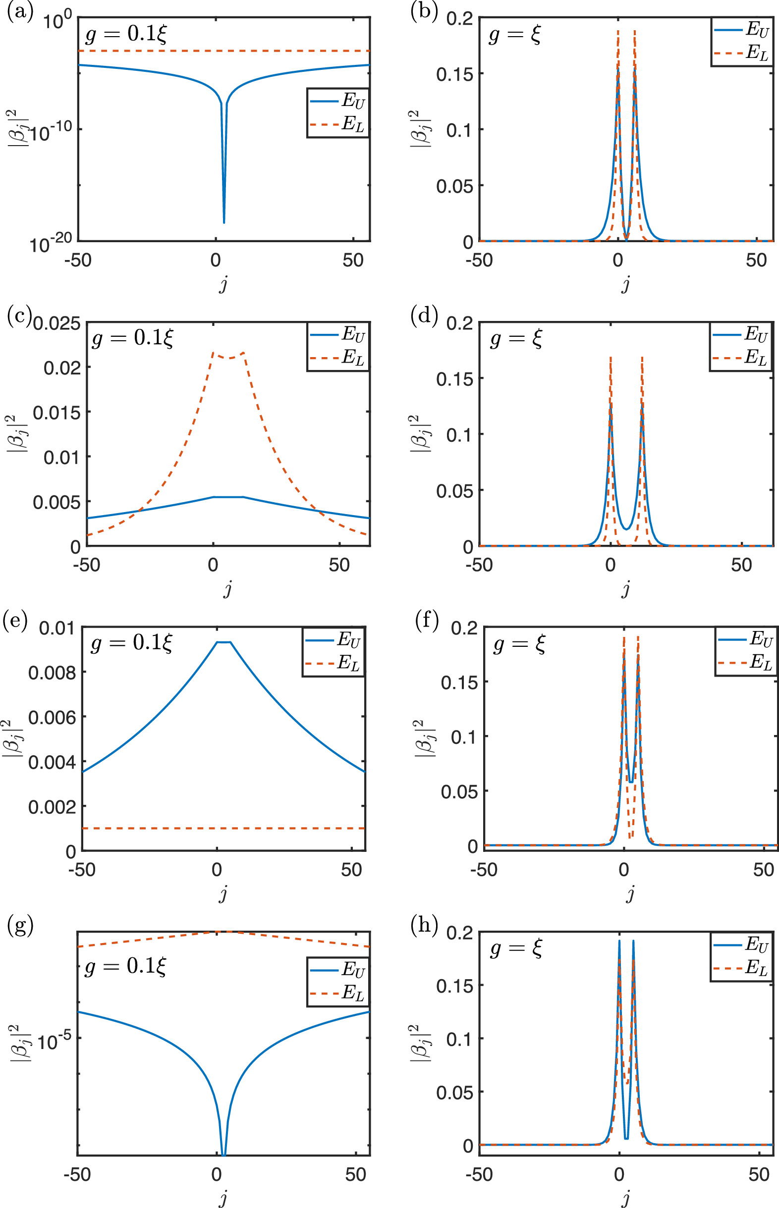 Figure 3. The photonic population in the waveguide for the BOCs ∣EU〉 and ∣EL〉. The parameters are set to (a), (b) Ω = − ξ, N = 6, φ = π. (c), (d) ${\rm{\Omega }}=-\sqrt{2}\xi ,N=12,\phi =0$. (e), (f) Ω = 0, N = 5, φ = π. (g), (h) Ω = 0, N = 5, φ = 0.