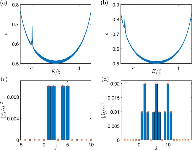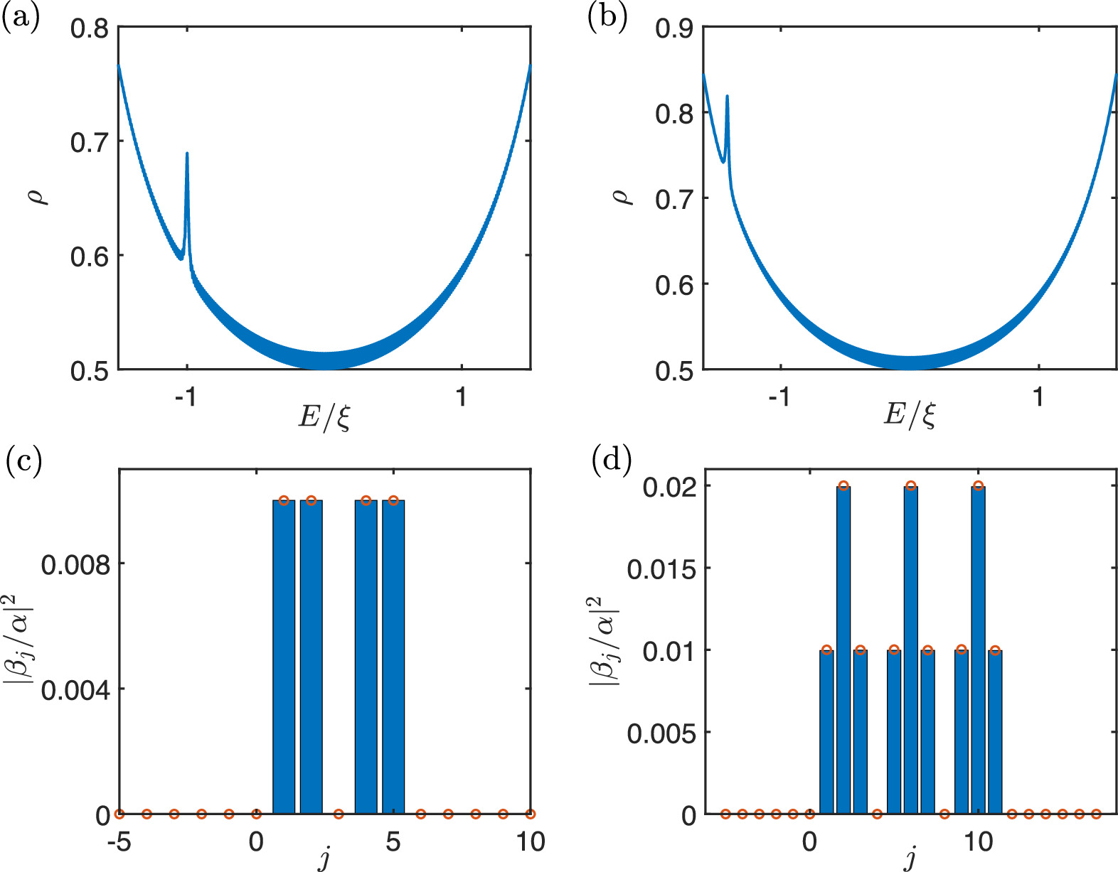 In the previous section, we discussed the BOCs in the giant atom–waveguide coupled system. We now turn to the continuous band. In figures 4(a) and (b), we plot the density of states (DOS), ρ, within the energy range −2ξ < E < 2ξ when the giant atom is decoupled from its resonant mode in the waveguide; that is, ∣G(K, φ)∣2 = 0. A single peak appears in both figures, precisely located at the atomic frequency Ω. As derived in Appendix B, we demonstrate that E = Ω satisfies the energy equation (equation (7)), corresponding to a discrete energy level. In figure 2, this energy level is indicated by the blue line, representing the BIC, as will be verified through both numerical and analytical approaches below.