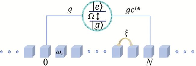Here, HA and Hc are the Hamiltonians of the giant atom and the CRW, respectively, and HI represents their interaction. We have used the rotating-wave and dipole approximations at each coupling point between the giant atom and the CRW. Ω is the transition frequency of the giant atom between the ground state ∣g〉 and the excited state ∣e〉. ωc is the intrinsic frequency of each resonator in the CRW. aj is the annihilation operator of the jth resonator in the CRW. σ+ = ∣e〉〈g∣ is the raising operator of the giant atom. ξ is the hopping strength between the nearest resonators in the CRW. g is the real coupling strength between the giant atom and the connected resonator. We have assumed that the coupling phase in the left leg is zero, while that for the right leg is φ. For the convenience of calculation, we will shift the energy level of the Hamiltonian and set ωc to zero in what follows.
