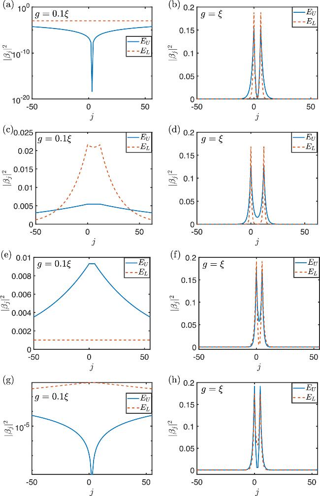 Based on the conditions listed in table 1, we further examine the photonic distributions of the topmost and bottommost states in figures 2(a) and (b) (both for even N), respectively. For the weak coupling strength g = 0.1ξ, both EU and EL exhibit extended characteristics (see figure 3(a)) when φ = π, indicating that neither state constitutes a bound state. Conversely, the results for φ = 0 in figure 3(c) demonstrate that the photonic amplitudes decay slowly beyond the region covered by the giant atom, which represents a characteristic bound-state feature. To obtain tighter bound states, we plot the results for larger g in figures 3(b) and (d), where photons become strongly localized near the two atom–waveguide coupling sites for both φ = π and φ = 0. Additionally, we present results for odd N in figures 3(e-h). When φ = π, the topmost state forms a bound state, while the bottommost state does not, as shown in figure 3(e). Conversely, when φ = 0, we observe the opposite behavior compared to the φ = π case, as demonstrated in figure 3(g). Under strong atom–waveguide coupling conditions, the photonic distributions in figures 3(f) and (h) reveal that both states become well-defined bound states, exhibiting similar characteristics to those observed for even N. These findings align with the conditions summarized in table 1. The presence of the coupling phase φ challenges the conventional conclusion that the bottommost state must necessarily be a BOC in giant atom–CRW systems [38].