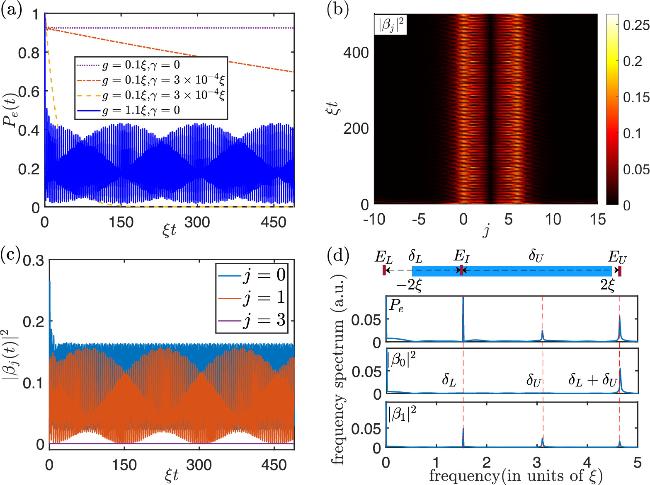 Figure 5. The dynamical evolution of the system. (a) The dynamics of the atomic population in its excited states. ωc = 0, Ω = − ξ, N = 4, φ = π for the yellow dashed curve and ωc = 0, Ω = − ξ, N = 6, φ = π for the other curves. (b) and (c) The dynamics of the photonic distribution. (d) The frequency spectra of the atomic and photonic dynamical evolutions obtained by numerical Fourier transformations from the time domain to the frequency domain. (b)–(d) The parameters are set to ωc = 0, Ω = − ξ, g = 1.1ξ, N = 6, φ = π.