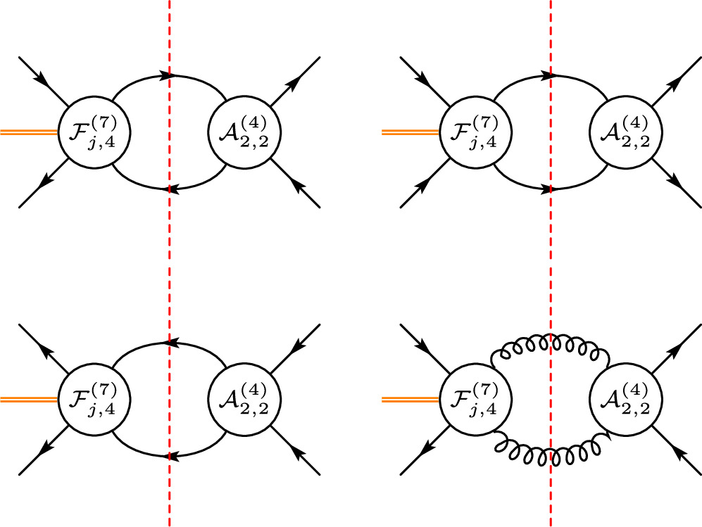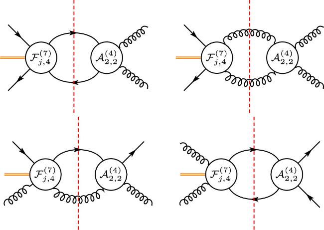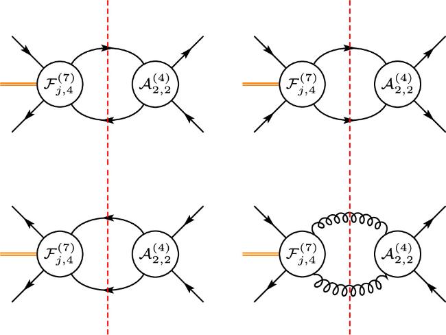 Figure 2. Double-cut diagrams for the on-shell one-loop form factors of dimension-7 $q\bar{q}gg$ form factors.