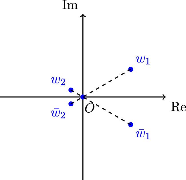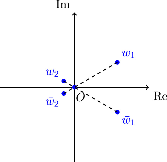 Figure 3. The points on the complex plane denote the poles of the integrand,where w1, w2 are the corresponding poles associated with z, ${\bar{w}}_{1},{\bar{w}}_{2}$ are the corresponding poles associated with $\bar{z}$, 0 is both for $z,\bar{z}$.