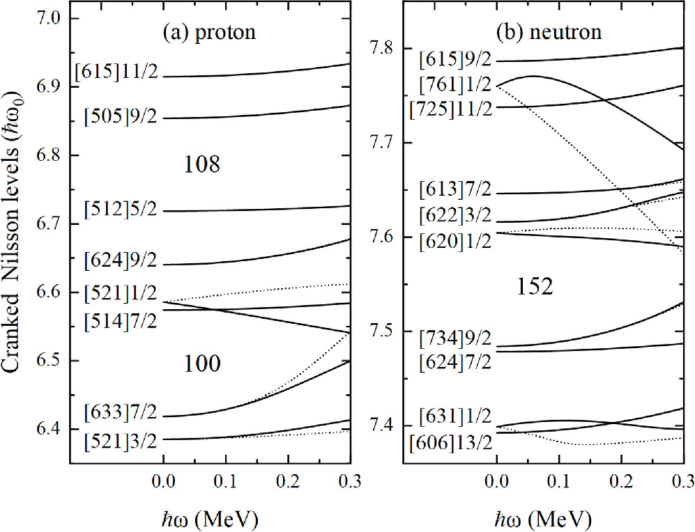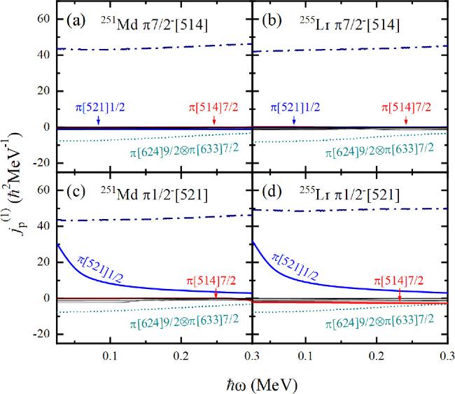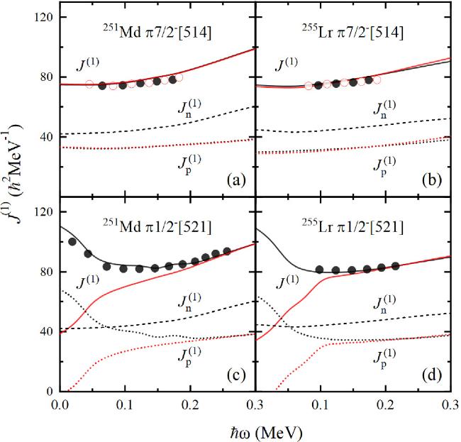 −[521] band is predicted with a significant signature splitting at low frequency that has not been observed experimentally. At higher frequency, the increase of the experimental MOIs