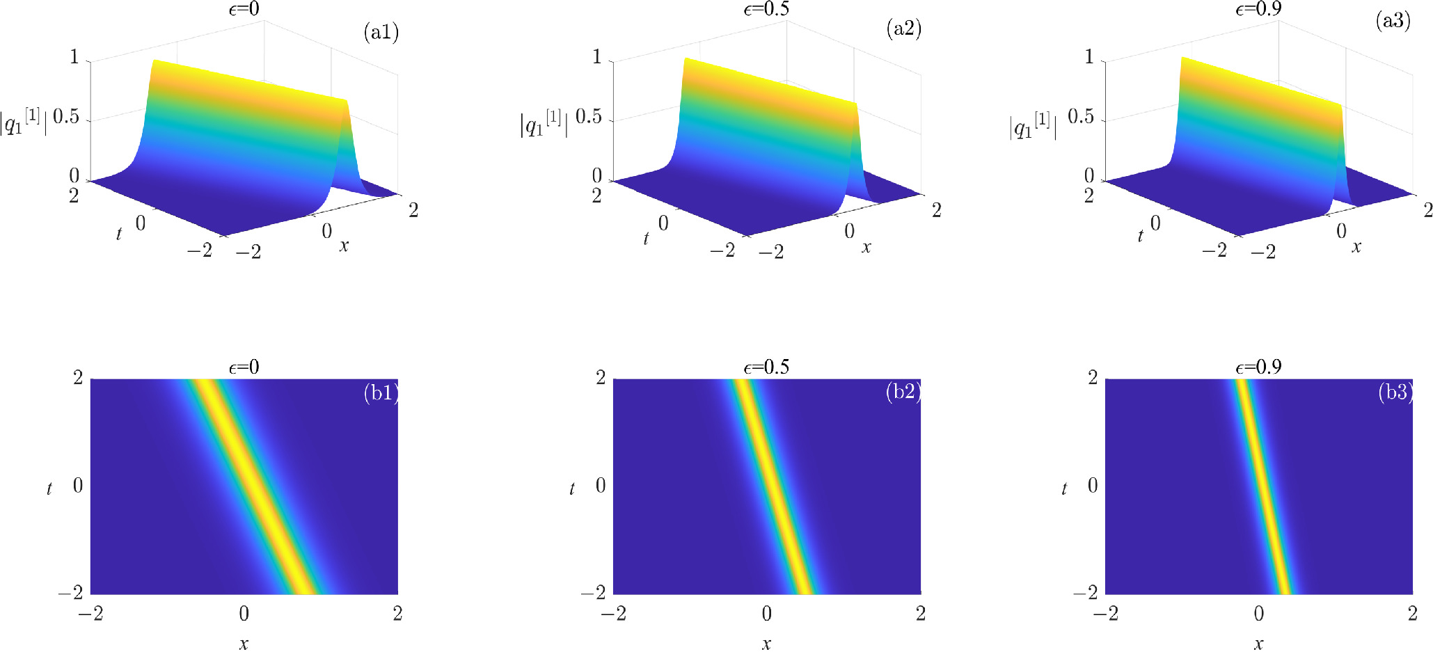 Their images are indicated in figures 2 and 3. From equation (112), we obtain that ${q}_{1}^{[1]}$ and ${q}_{2}^{[1]}$ are essentially the same, with differences only in the amplitude coefficients ${v}_{11}^{* }$ and ${v}_{12}^{* }$. When v11 = 1, v12 = 2 and ${\zeta }_{1}=1+\frac{{\rm{i}}}{2}$, the three-dimensional and the density images of ${q}_{1}^{[1]}$ are shown in figure 2 for the fractional exponent ε = 0, 0.5, 0.9. At ε = 0.5, the wave propagation plot of ${q}_{1}^{[1]}$ along the x-axis at t = −2, 0, 2 is shown in figure 3(c1). We find that ${q}_{1}^{[1]}$ behaves as a left-traveling wave soliton at ε = 0.5. Figure 3(c2) displays the wave propagation plot of ${q}_{1}^{[1]}$ at t = −1 for ε = 0, 0.5, 0.9. It is evident that as ε increases, the displacement of the soliton decreases.