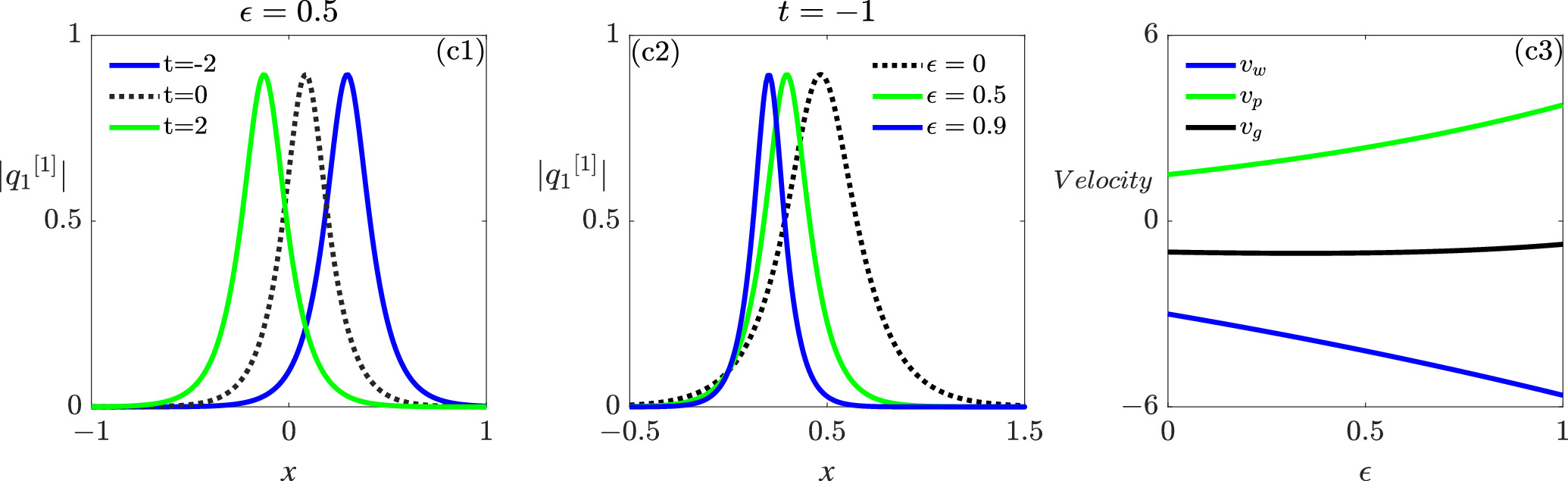 Figure 3. (c1): When ε = 0.5, the wave propagation plot of ${q}_{1}^{[1]}$ along the x-axis at t = −2, 0, 2. (c2): When t = −1, the wave propagation plot of ${q}_{1}^{[1]}$ along the x-axis at ε = 0, 0.5, 0.9. (c3): The wave velocity, phase velocity and group velocity of the fractional one-soliton solution ${q}_{1}^{[1]}$ by choosing ξ1 = 1, ${\eta }_{1}=\frac{1}{2}$.