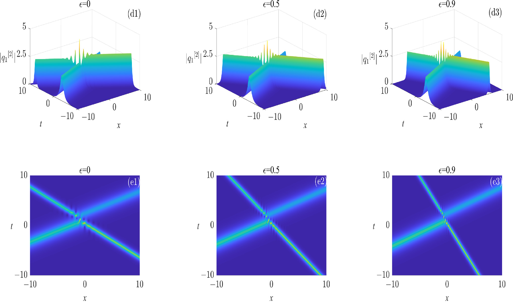 Their images are shown in figures 4 and 5. When ${\zeta }_{1}=\frac{1}{2}+\frac{3}{5}{\rm{i}}$ and ${\zeta }_{2}=\frac{9}{10}+\frac{4}{5}{\rm{i}}$, the three-dimensional images and the density images of ${q}_{1}^{[2]}$ are indicated in figure 4 with the fractional exponent ε = 0, 0.5, 0.9. At t → ±∞, the right-traveling wave with higher energy and the left-traveling wave with lower energy are far apart. After a strong collision, their energies convert between each other while maintaining their original velocities, yet the total energy remains conserved before and after the collision. When ε = 0.5, the wave propagation plot of ${q}_{1}^{[2]}$ and ${q}_{2}^{[2]}$ along the x-axis at t = −5, −2, 4, 7 are shown in figures 5(f1)–(f2). In addition, figure 5(f3) shows the wave propagation plot of ${q}_{1}^{[2]}$ at t = 4 when ε = 0, 0.5, 0.9. It is evident that as the power ε of the fractional derivative increases, the width of the soliton decreases, and the soliton moves increasingly closer.