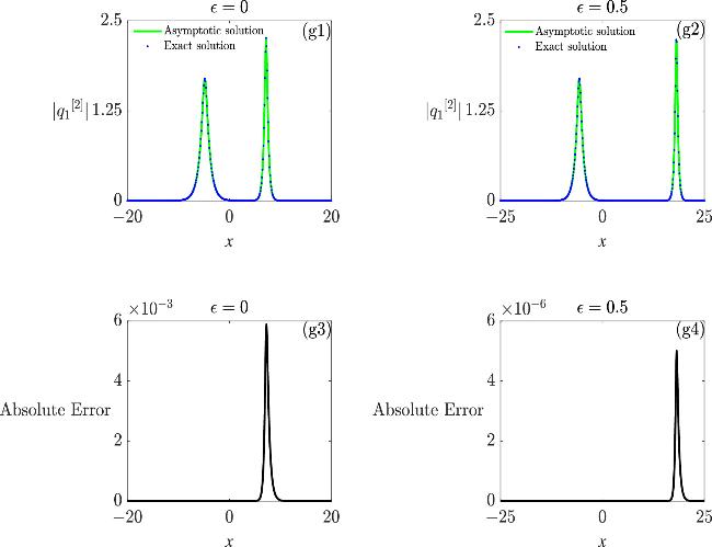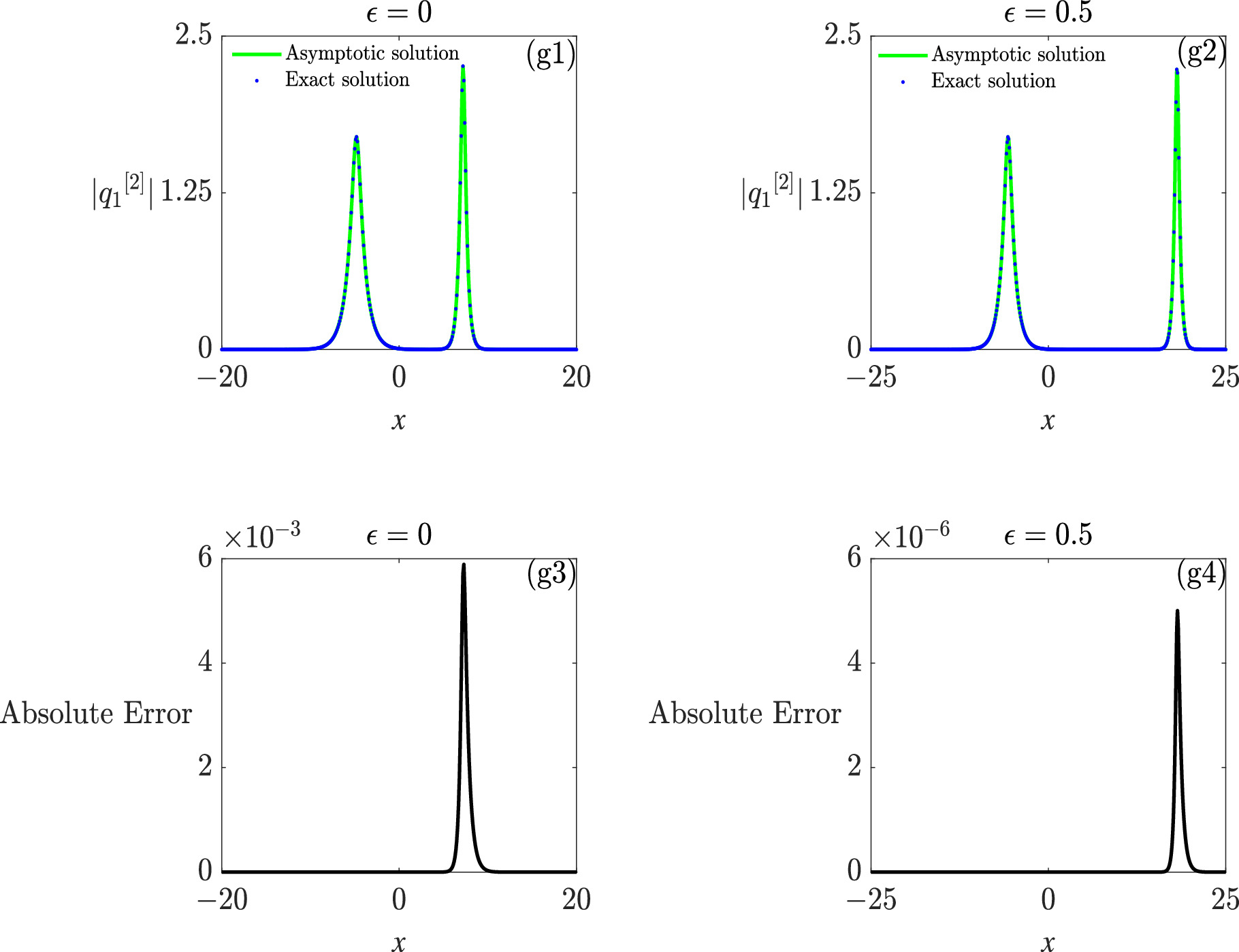 Figure 6. (g1)–(g2): The comparison plot of the exact and asymptotic expressions of the two-soliton solution at t = −10 for ε = 0, 0.5. (g3)–(g4): When ε = 0, the absolute error ($| {q}_{1,-}^{[2]}-{q}_{1}^{[2]}| $) plot between the exact and asymptotic expressions of the two-soliton solution at t = −10.