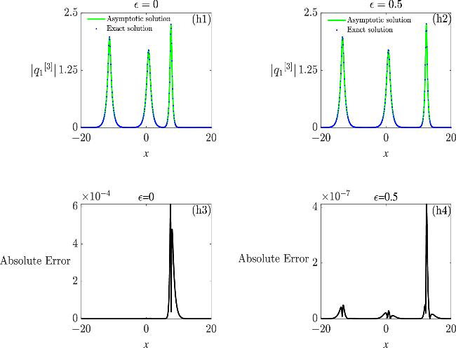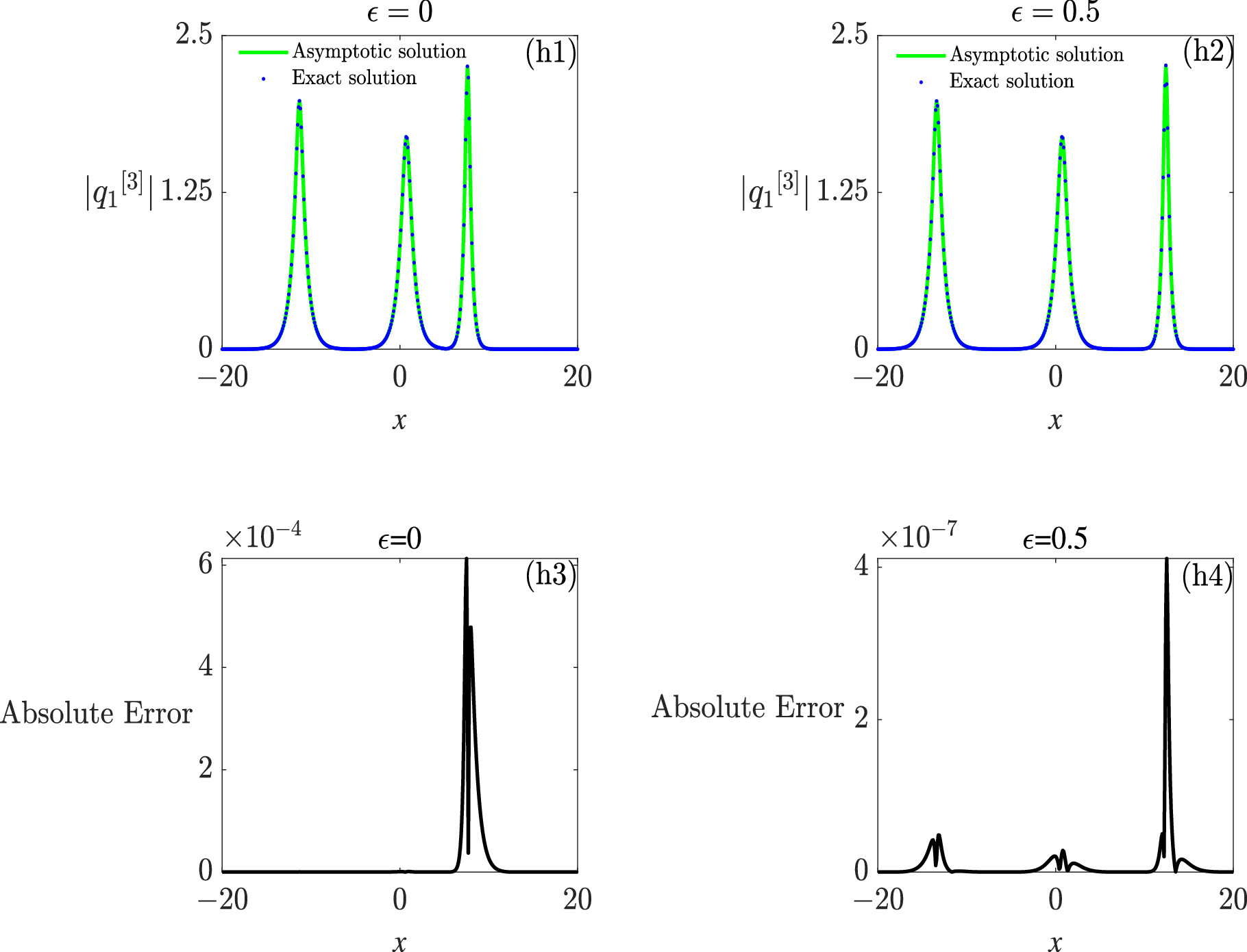 Figure 7. (h1)–(h2): The comparison plot of the exact and asymptotic expressions of the three-soliton solution at t = −10 for ε = 0, 0.5. (h3)–(h4): When ε = 0, 0.5, the absolute error ($| {q}_{1,-}^{[3]}-{q}_{1}^{[3]}| $) plot between the exact and asymptotic expressions of the three-soliton solution at t = −10.