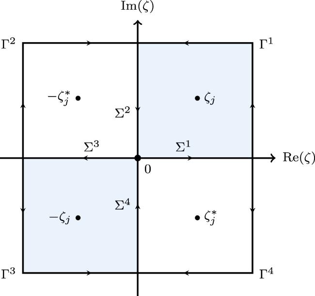 which implies that s11(ζ; t) = s11(− ζ;t) = ${\tilde{s}}_{11}^{* }({\zeta }^{* };t)$ = ${\tilde{s}}_{11}^{* }(-{\zeta }^{* };t)$. Suppose that s11 contains 2N simple zeros, expressed as ±ζk(1 ≤ k ≤ N). At the same time, ${\tilde{s}}_{11}$ also possesses 2N simple zeros defined by $\pm {\zeta }_{k}^{* }$(1 ≤ k ≤ N). The zeros ζ = ± ζk and $\zeta =\pm {\zeta }_{k}^{* }$ of s11 and ${\tilde{s}}_{11}$ are also called the discrete spectra of equation (23), respectively. Moreover, the continuous spectra of equation (23) all lie on Σ, which is shown in figure 1.