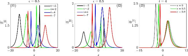 Figure 5. (f1): When ε = 0.5, the wave propagation plot of ${q}_{1}^{[2]}$ along the x-axis at t = −5, −2, 4, 7. (f2): When ε = 0.5, the wave propagation plot of ${q}_{2}^{[2]}$ along the x-axis at t = −5, −2, 4, 7. (f3): When t = 4, the wave propagation plot of ${q}_{1}^{[2]}$ along the x-axis at ε = 0, 0.5, 0.9.