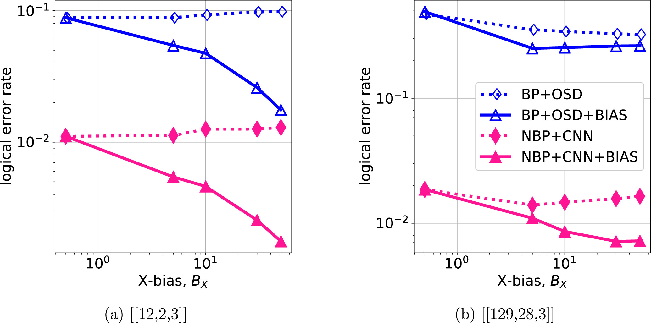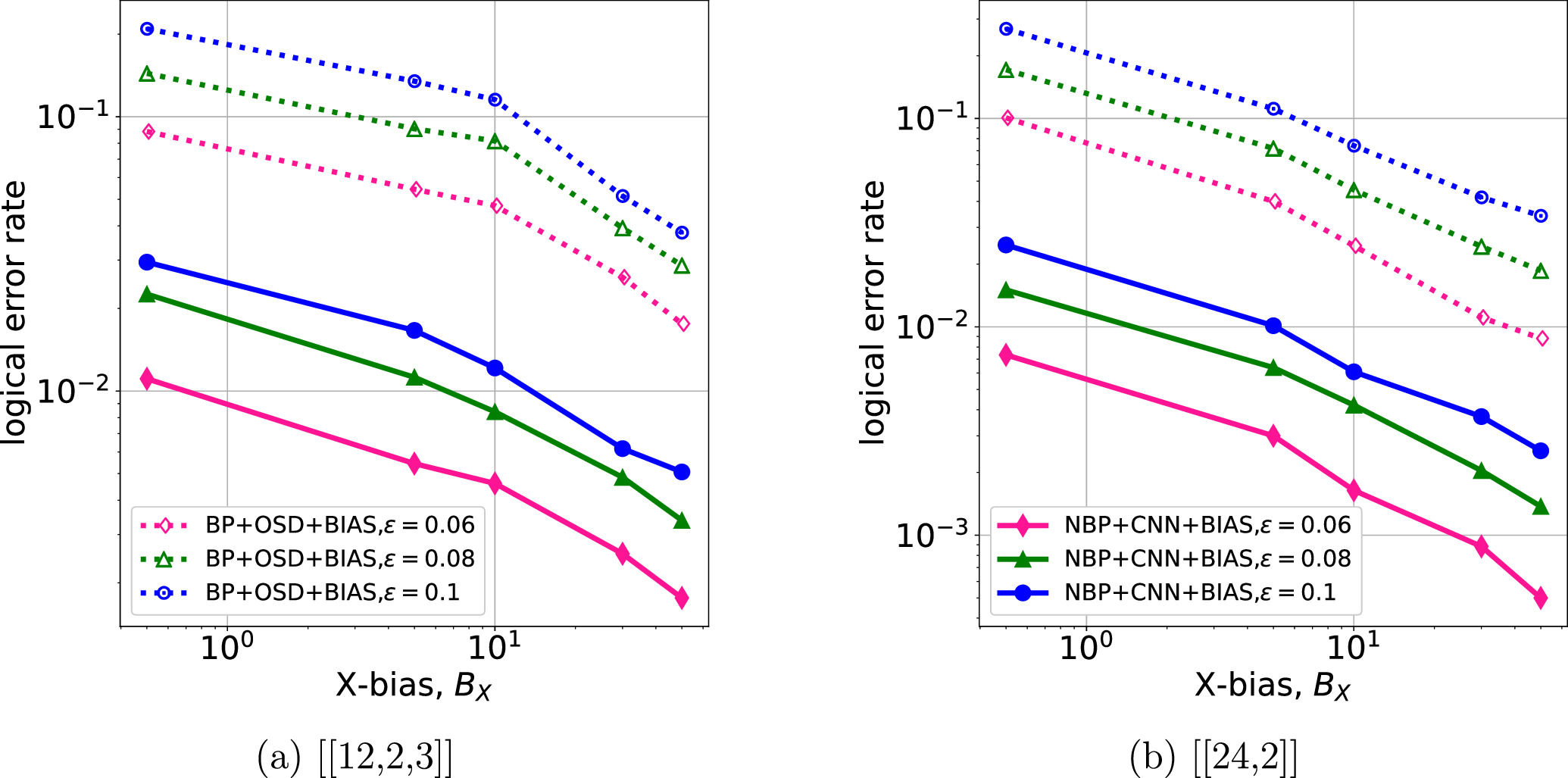 Figure 9. Standard CSS quantum codes versus bias-tailored XZZX quantum codes. All legends with the suffix ‘BIAS' represent the decoding of the bias-tailored codes using the biased noise model. All the data results are obtained with a physical error rate of ε = 0.06. The OSD orders of [[12,2,3]] and [[129,28,3]] are 7 and 30, respectively. |