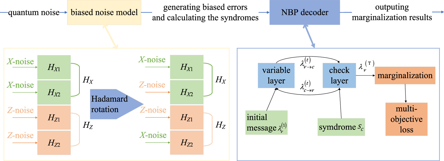 Figure 1. The structure of NBP + BIAS decoder. The decoder mainly consists of a biased noise model and a neural belief propagation (NBP) decoder using a multi-objective loss function. |