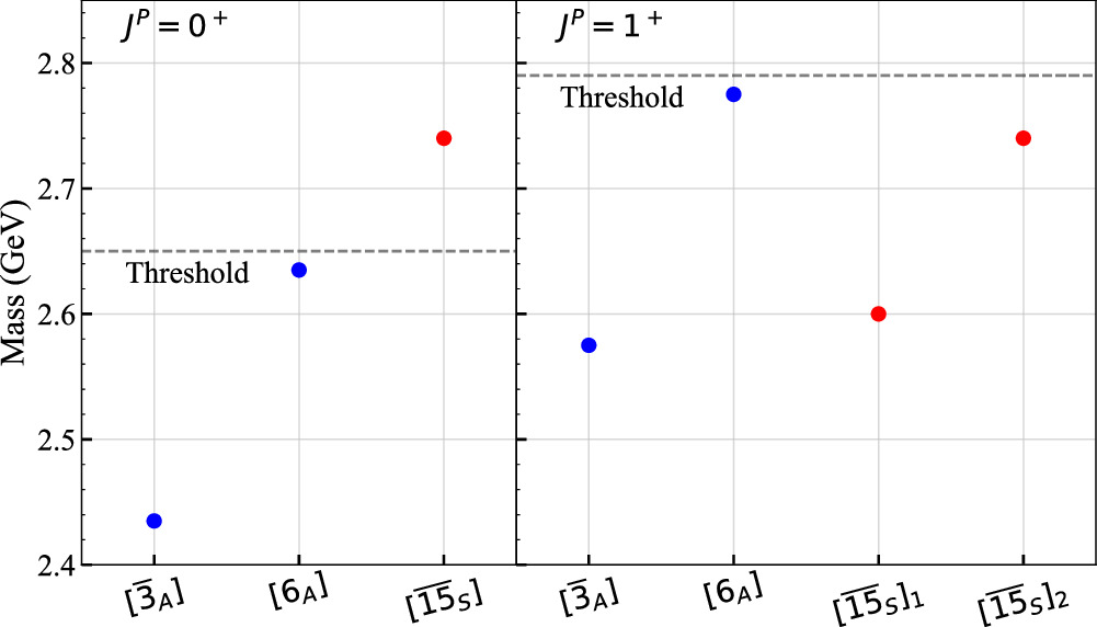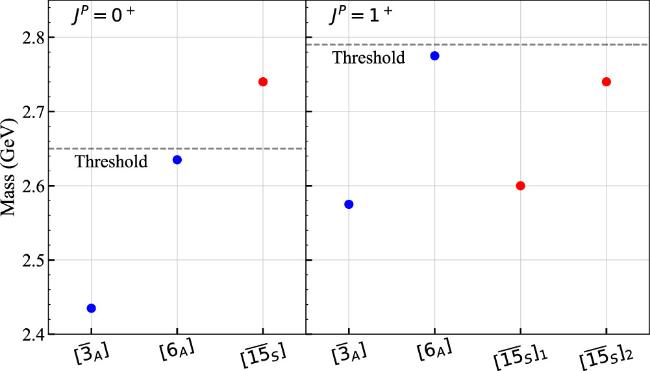 Figure 1. Sketch of the spectrum of scalar and axial-vector tetraquarks in the diquark–anti-diquark model for a pion mass of about 700 MeV. Blue (red) symbols refer to states containing spin-zero (spin-one) light diquarks. In contrast, in the molecular picture, only the analogs of the blue states appear with the higher one being located on the unphysical sheet. |
