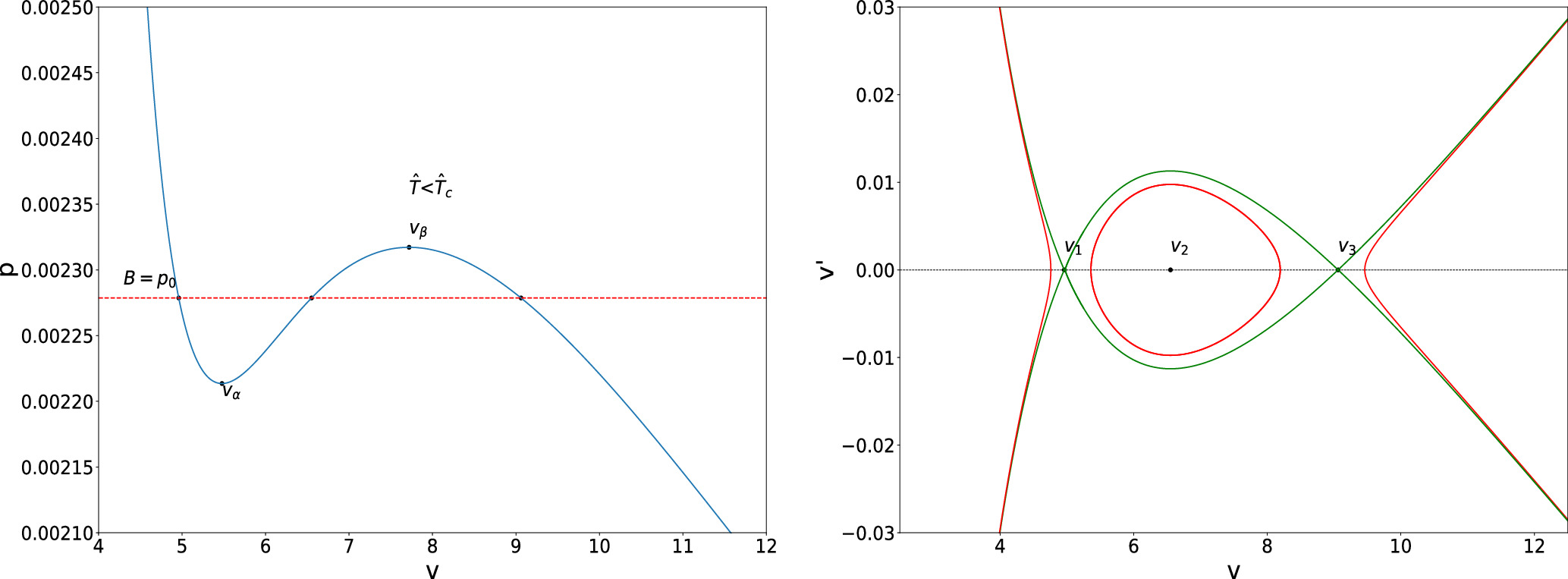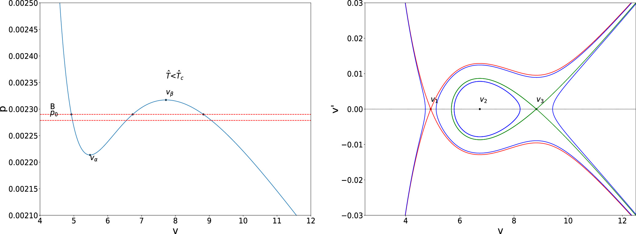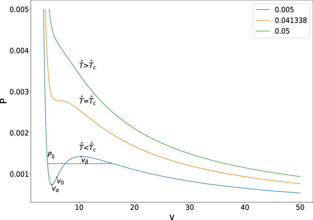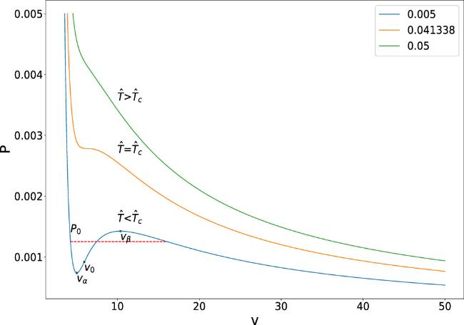 When $\widehat{T}\lt {\widehat{T}}_{c}$, the P−v curve in figure 1 can be divided into two stable and one unstable regions. The two points vα and vβ are two extreme points, which satisfy
