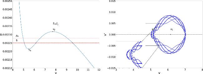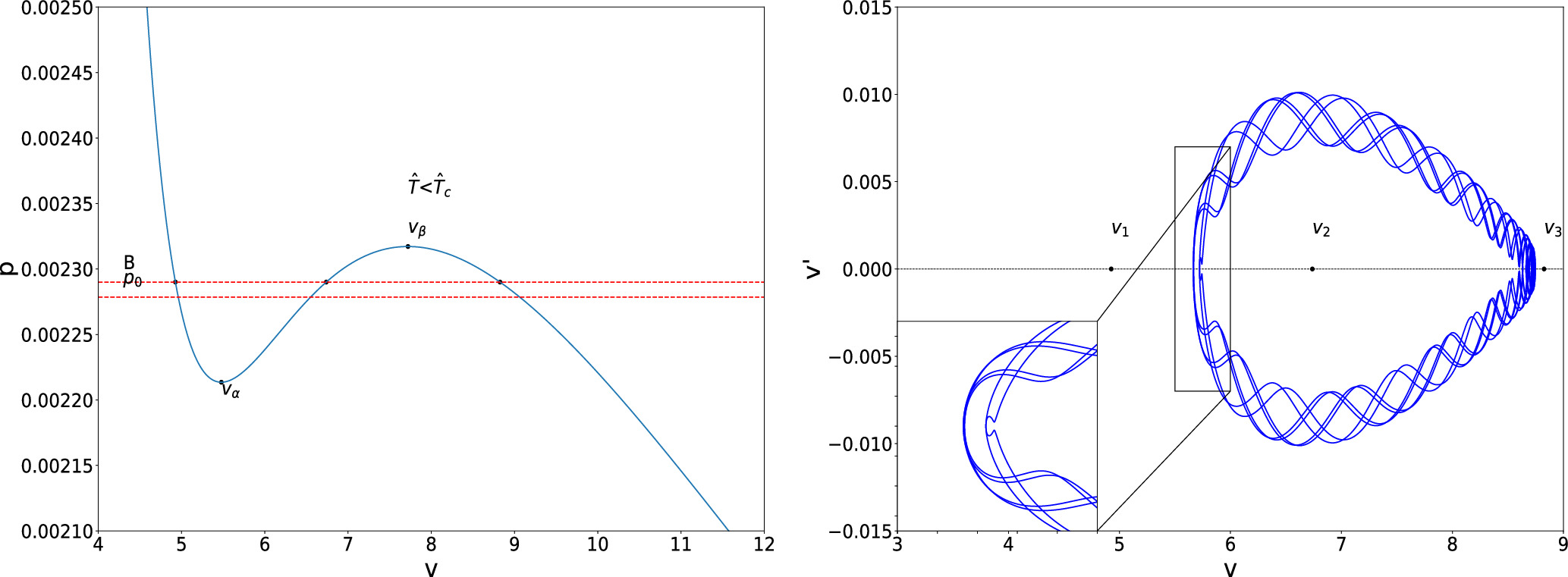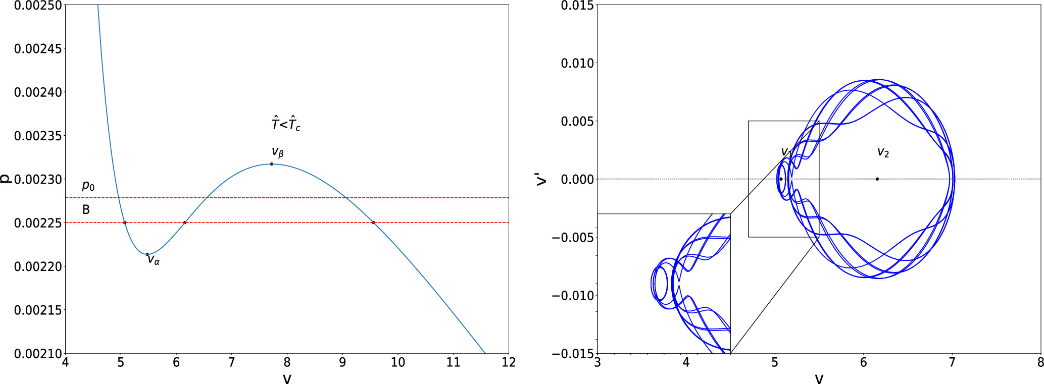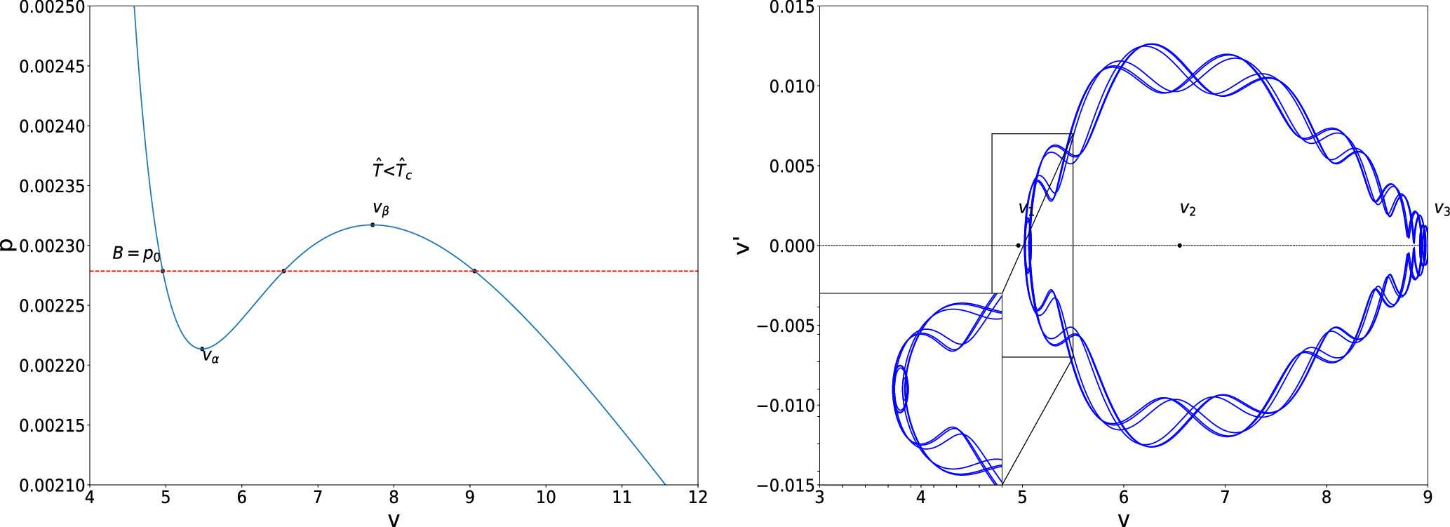 When $\widehat{T}\lt {\widehat{T}}_{c}$, the P−v curve in figure 1 can be divided into two stable and one unstable regions. The two points vα and vβ are two extreme points, which satisfy
