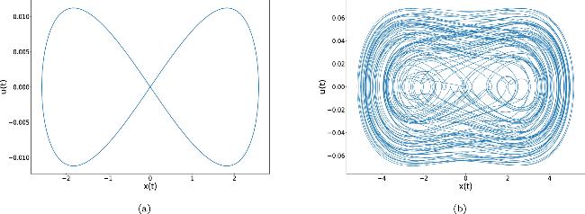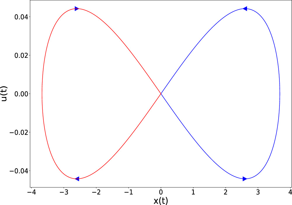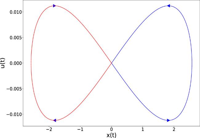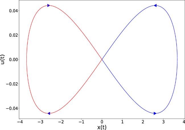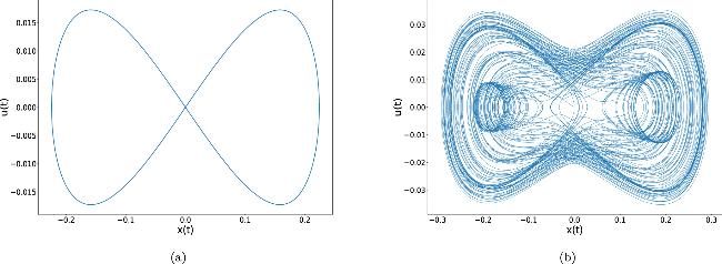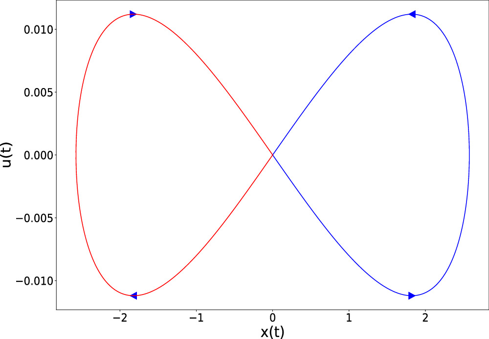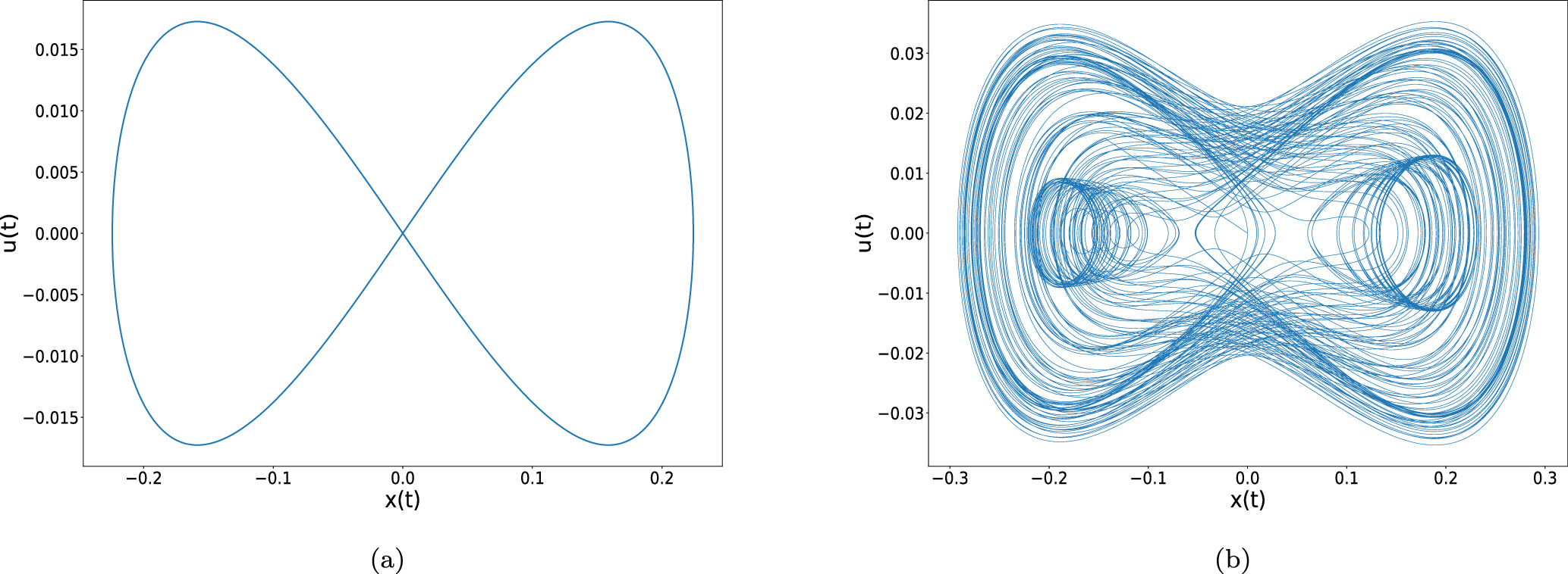 In figure 5, we present numerical results of equations of motion (30) in the phase plane x(t) − u(t). It is shown that as $\delta \lt {\delta }_{c}^{Pv}$, the perturbation system still maintaining a normal butterfly-like trajectory as before. As $\delta \gt {\delta }_{c}^{Pv}$, one can find that the trajectories in the phase plane become unpredictable and complex, and the dynamical evolution of the system occurs chaotic phenomenon.