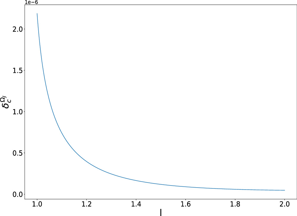 is satisfied. In figure 14, we plot the evolution of the equations of motion (63) numerically. It can be seen that the trajectories exhibit chaotic behaviors if $\delta \gt {\delta }_{c}^{{\rm{\Omega }}J}$, otherwise the perturbation system still keeps the two branches as before. From equation (68), one can know that the critical value ${\delta }_{c}^{{\rm{\Omega }}J}$ depends on the cosmological parameter l. Figure 15 shows that ${\delta }_{c}^{{\rm{\Omega }}J}$ is decreasing with l, which means a larger l values lower the threshold for chaos.