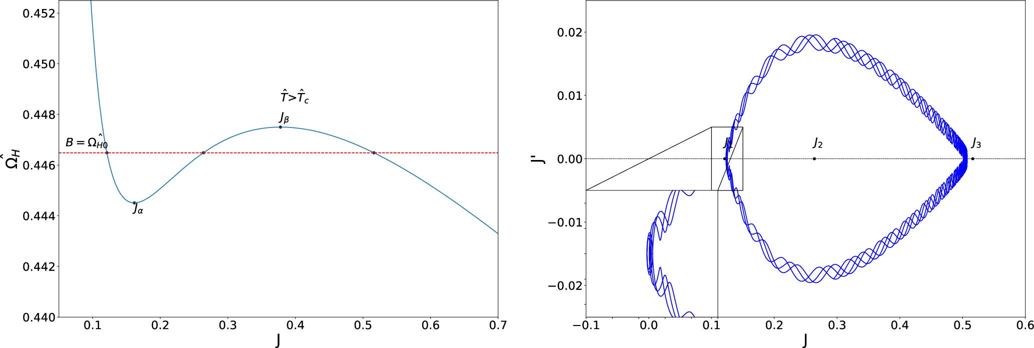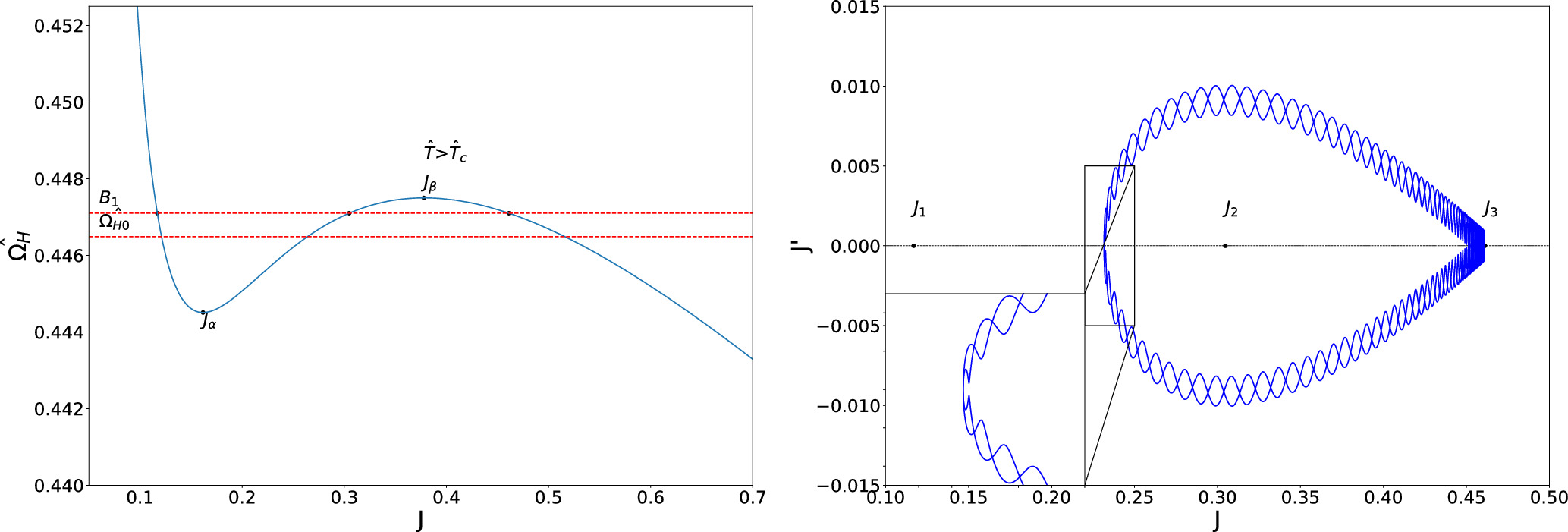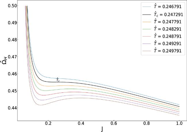 Equations (15)–(17) can be viewed as equations of state of the Kerr-AdS black hole on the (${\widehat{{\rm{\Omega }}}}_{H}$, J) section, i.e., ${\widehat{{\rm{\Omega }}}}_{H}={\widehat{{\rm{\Omega }}}}_{H}(J,\widehat{T})$.