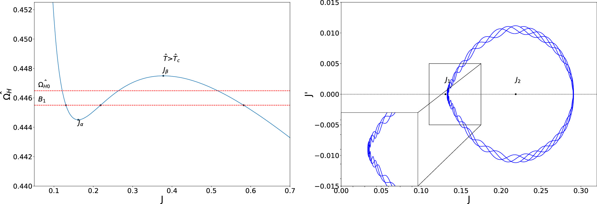Figure 13. Homoclinic orbit of the unperturbed equations with ${\widehat{T}}_{0}=0.038\lt {\widehat{T}}_{c}$ on the (${\widehat{{\rm{\Omega }}}}_{H}$, J) section of the Kerr-AdS black hole. We set l = 1.