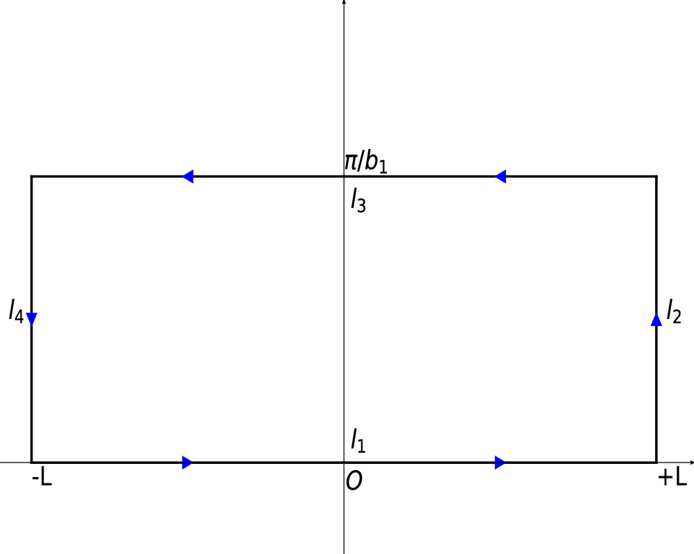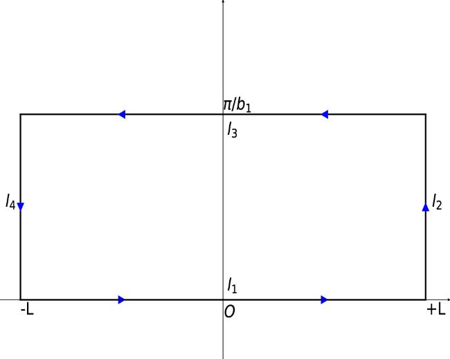 Let L → ∞, according to the residue theorem, the right-hand side of the above equation should be equal to 2πi × [the sum of residues of the singularities of function f(z) within the range of $0\lt {\rm{Imz}}\lt \frac{\pi }{{b}_{1}}$]. There is only one second-order singularity $\frac{\pi {\rm{i}}}{2{b}_{1}}$, and yields