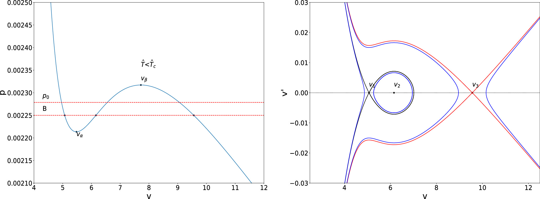 Figure 8. For $P({v}_{\alpha },{\widehat{T}}_{0})\lt B\lt {P}_{0}$, P − v diagram and $v-{v}^{{\prime} }$ phase portrait. A homoclinic orbit connecting v1 to itself (the red line).