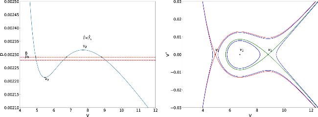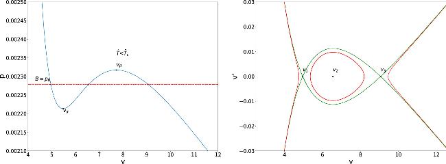 Figure 7. For ${P}_{0}\lt B\lt P({v}_{\beta },{\widehat{T}}_{0})$, P − v diagram and $v-{v}^{{\prime} }$ phase portrait. A homoclinic orbit connecting v3 to itself (the green line).
