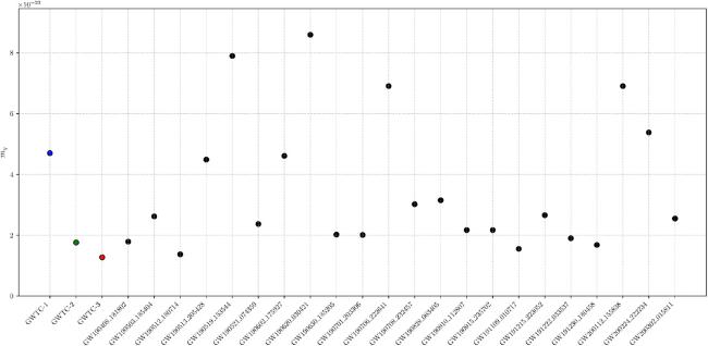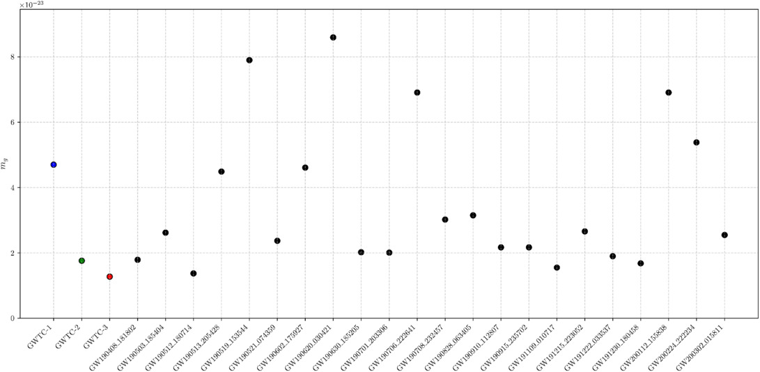 Figure 3. The scatter plot of 90% credible upper bounds on the mg for selected GW events of BBH in GWTC-2.1 and GWTC-3, with data points colored in black. Results from GWTC-1, GWTC-2, and GWTC-3 are represented by blue, green, and red markers, respectively. |