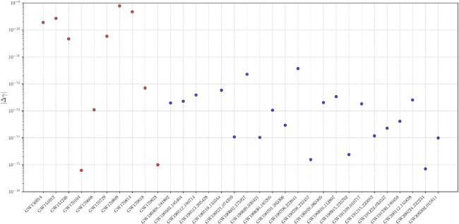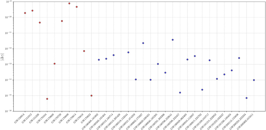 Figure 4. The scatter plot of 90% credible upper bounds on the ∣Δγ∣ for selected GW events of BBH in GWTC-2.1 and GWTC-3, with data points colored in blue. Results from GWTC-1 are represented by red markers. |